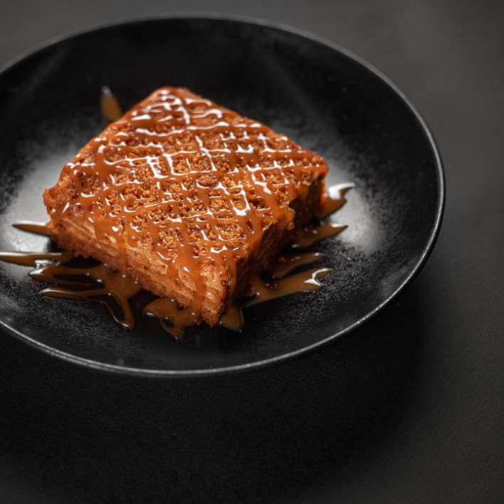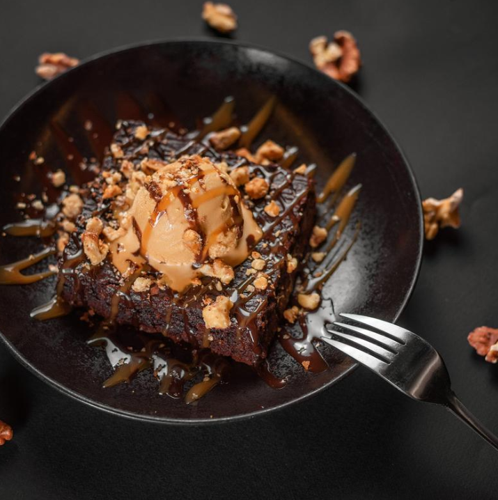 Знаменитый шоколадный бисквит. Подается с карамельным и шоколадным топпингом, орехом кешью и арахисом.
