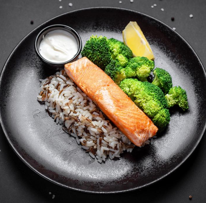 Стейк из красной рыбы на гриле, подается со смесью дикого и пропаренного риса, бланшированной брокколи, соусом Ранч и долькой лимона.