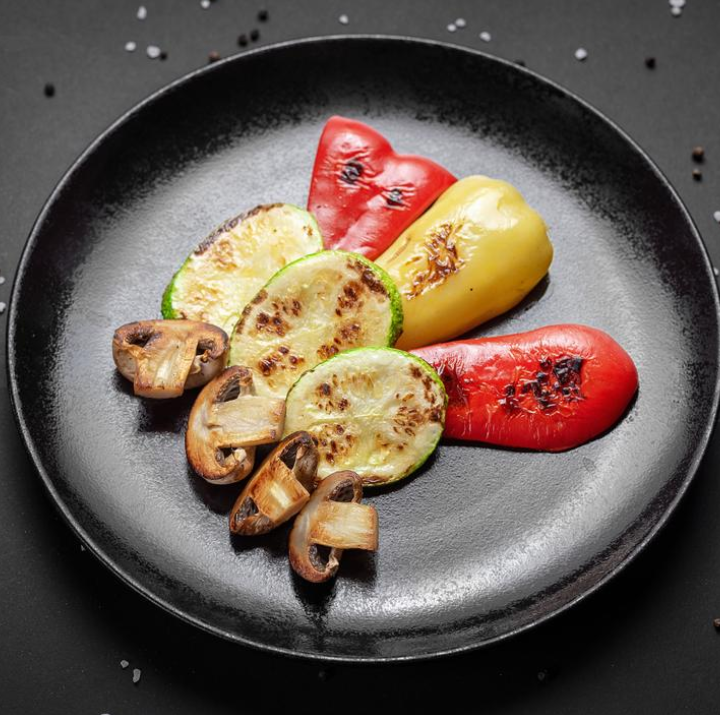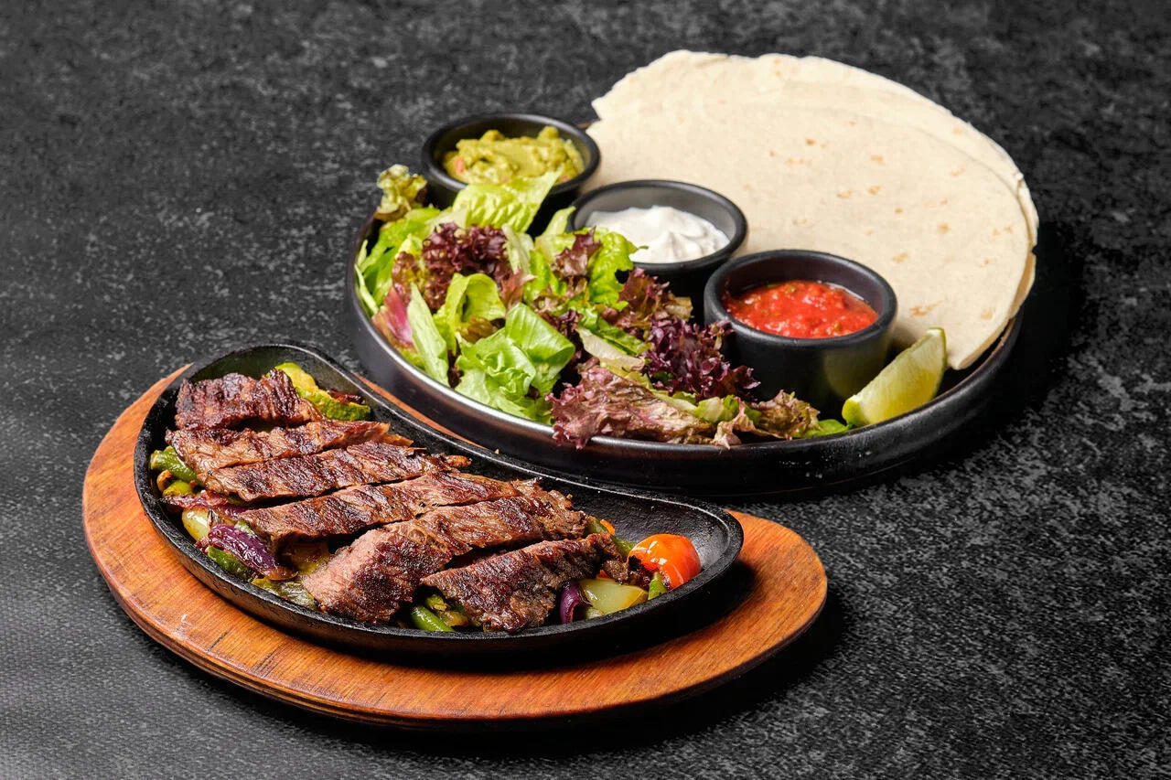 Обжаренный болгарский перец, лук, кабачок, фасоль стручковая, маринованный стейк Скерт. Подается с пшеничными лепешками, миксом салата, соусом гуакомоле и сальса.