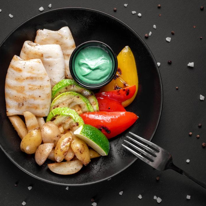 Филе кальмара, обжаренное на гриле с беби картофелем, кабачком и болгарским перцем. Подается с соусом медовый васаби и долькой лайма.