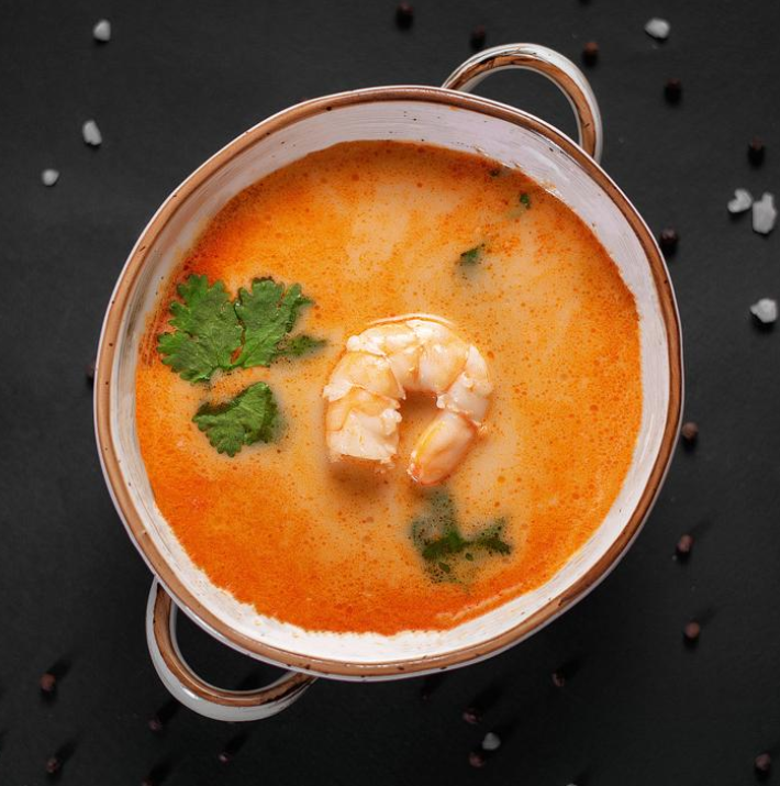 Самый популярный тайский суп с рисом на основе кокосового молока и микса из морепродуктов.