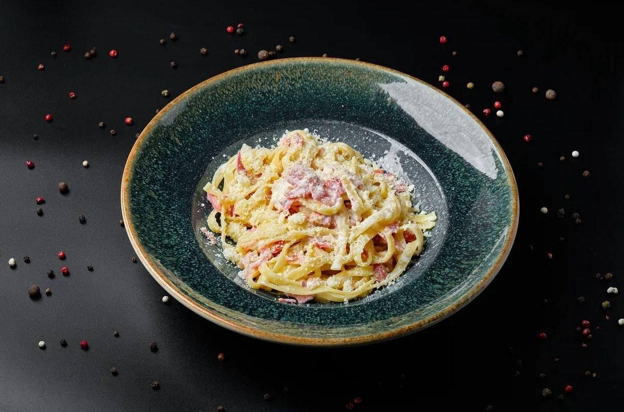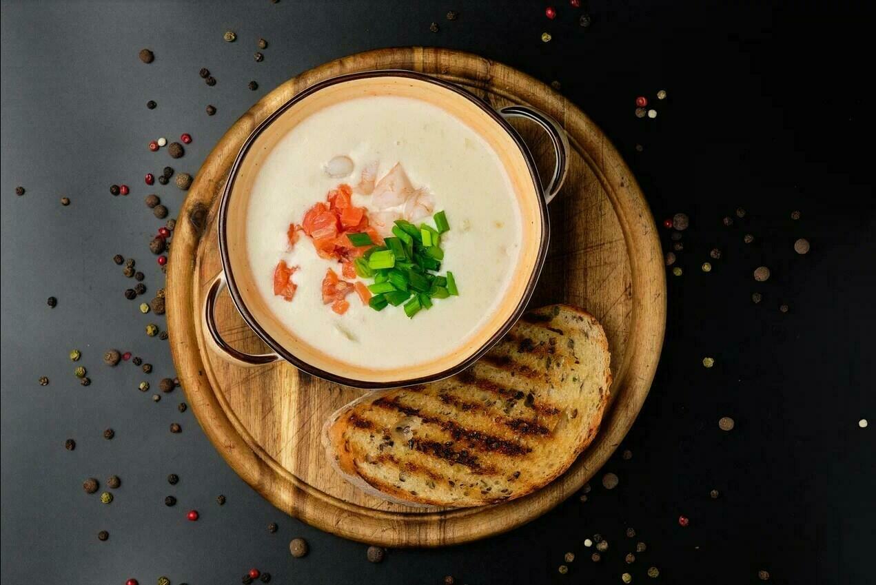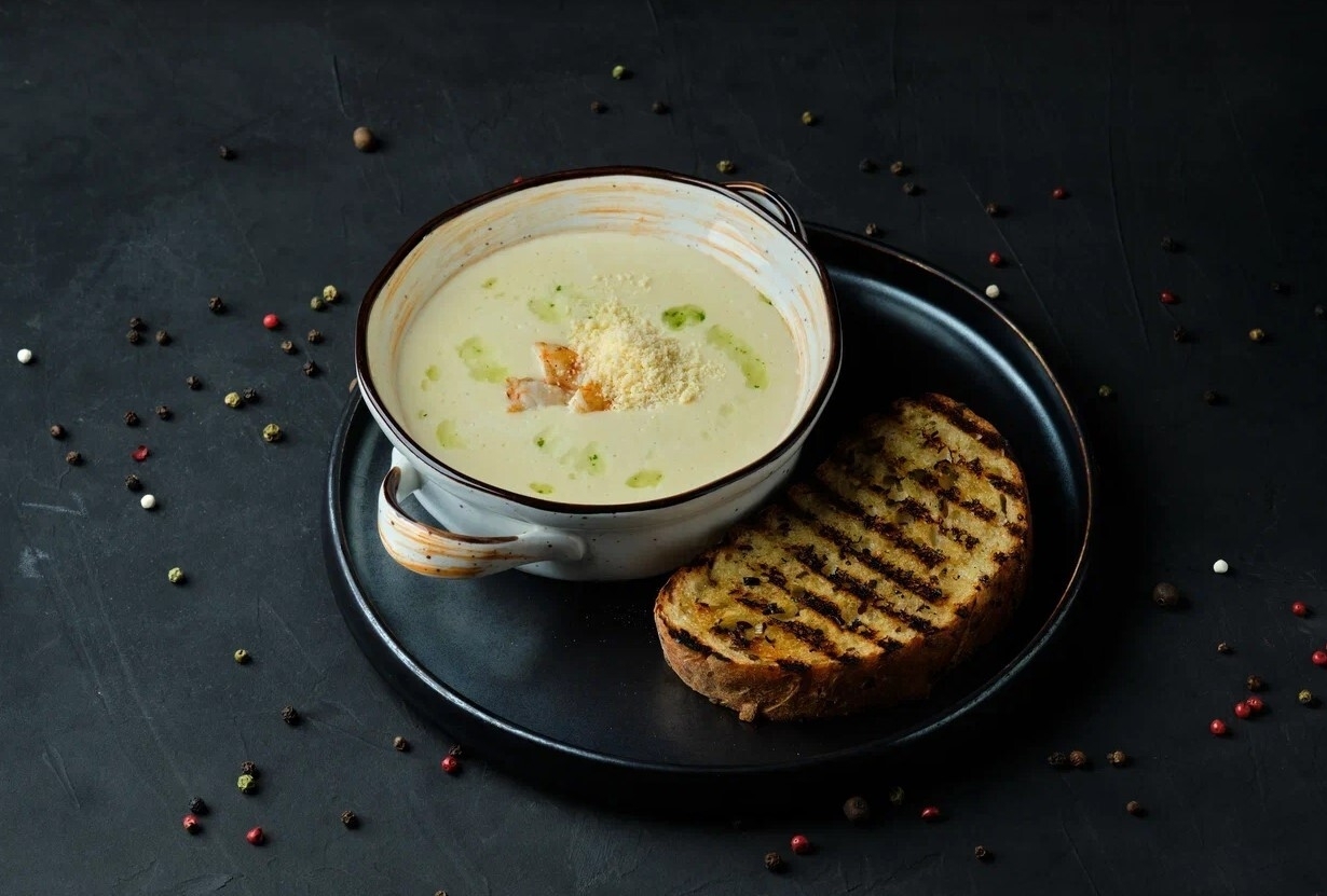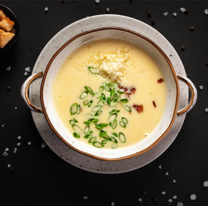 Сливочный сырный суп, обжаренный бекон, сыр Пармезан, зеленый лук.