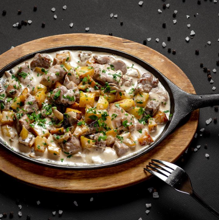 Свинина, обжаренная с грибами, картофелем, зеленью и сливками с добавлением перечного соуса.