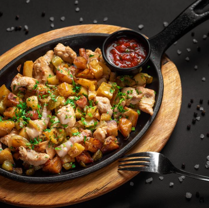 Бекон и куриное филе, обжаренные с картофелем и маринованными огурцами. Подается с соусом сальса и свежей зеленью.