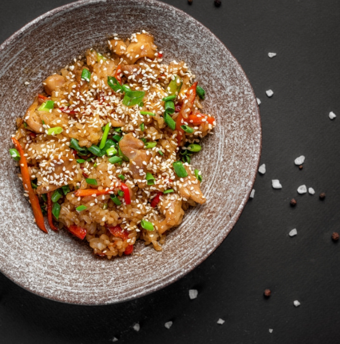 Курица, обжаренная на тепане с кабачком, морковью, шампиньонами, болгарским перцем и кунжутом в соусе терияки.