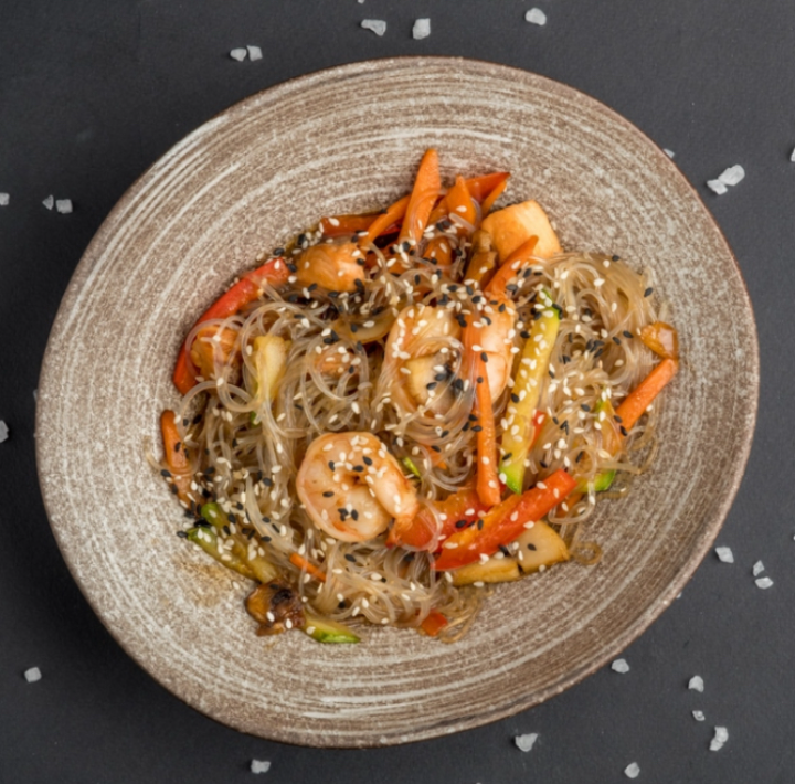 Традиционная азиатская фунчоза, креветки, лосось, цукини, морковь, болгарский перец, шампиньоны, кунжут и соус терияки.