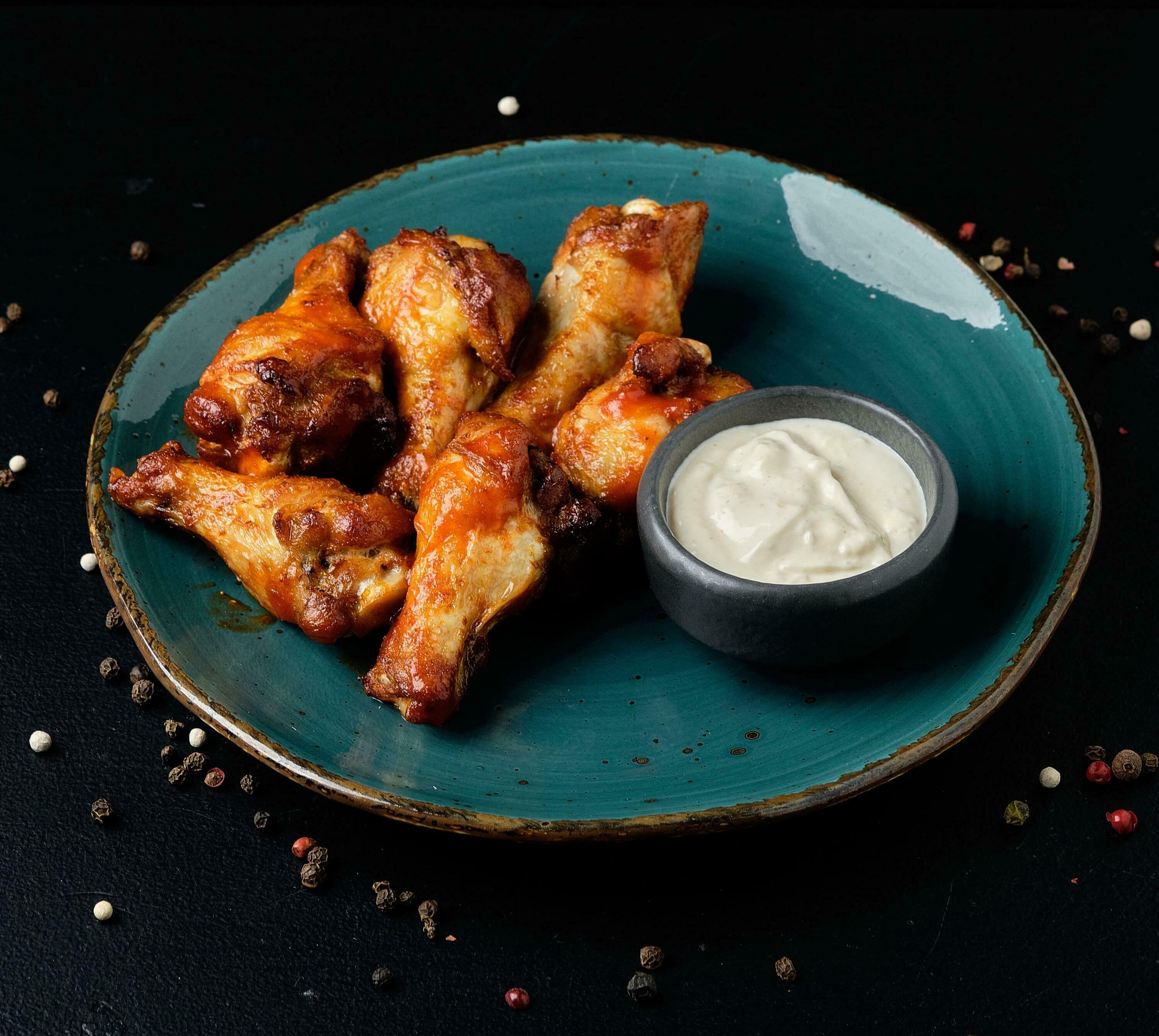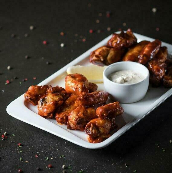 Комбо набор 2-х видов крыльев BBQ and HOT. Подается с соусом блю чиз и лимоном.