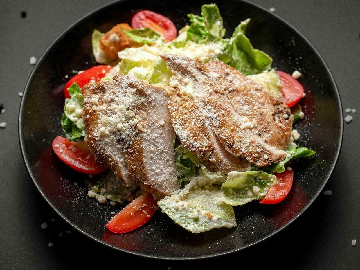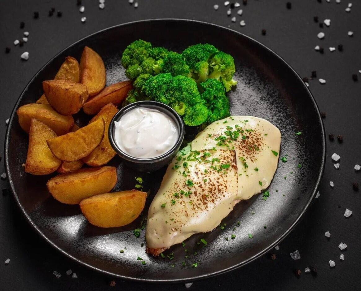 Обжаренная куриная грудка под сливочно-шпинатным соусом с сыром эмменталь. Подается с бланшированной брокколи, картофельными дольками и соусом ранч.