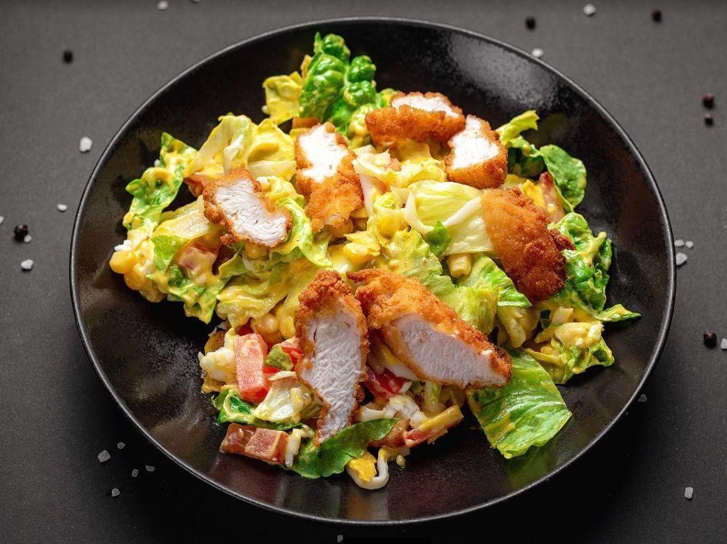 Курица фри, помидоры, кукуруза, моцарелла, микс салата, медово-горчичный соус, соломка из кукурузной лепешки.