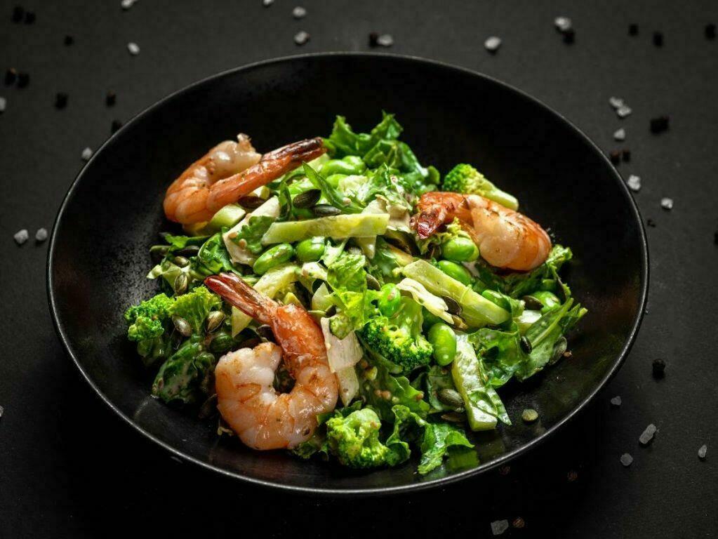 Лист салата, авокадо, руккола, бланшированная брокколи, бобы Эдамамэ, свежий огурец, кунжутный соус, тыквенные семечки, обжаренные креветки.