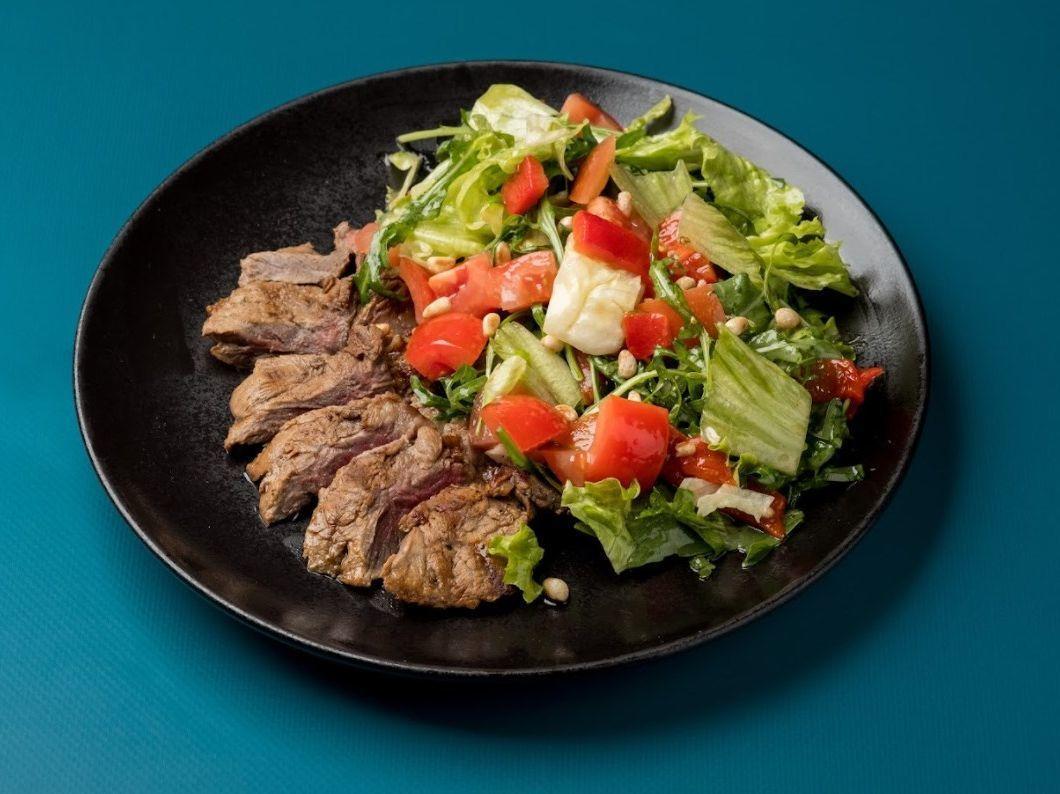 Стейк скерт, микс салатных листьев, руккола, свежие томаты, печеный перец, кедровые орешки, крем бальзамический.