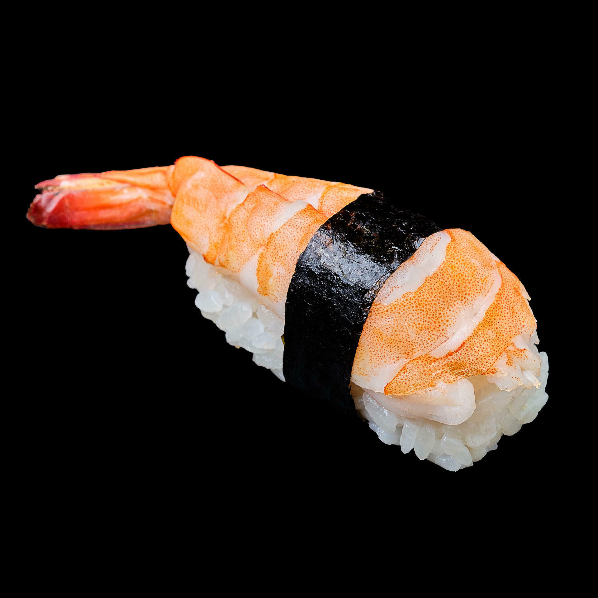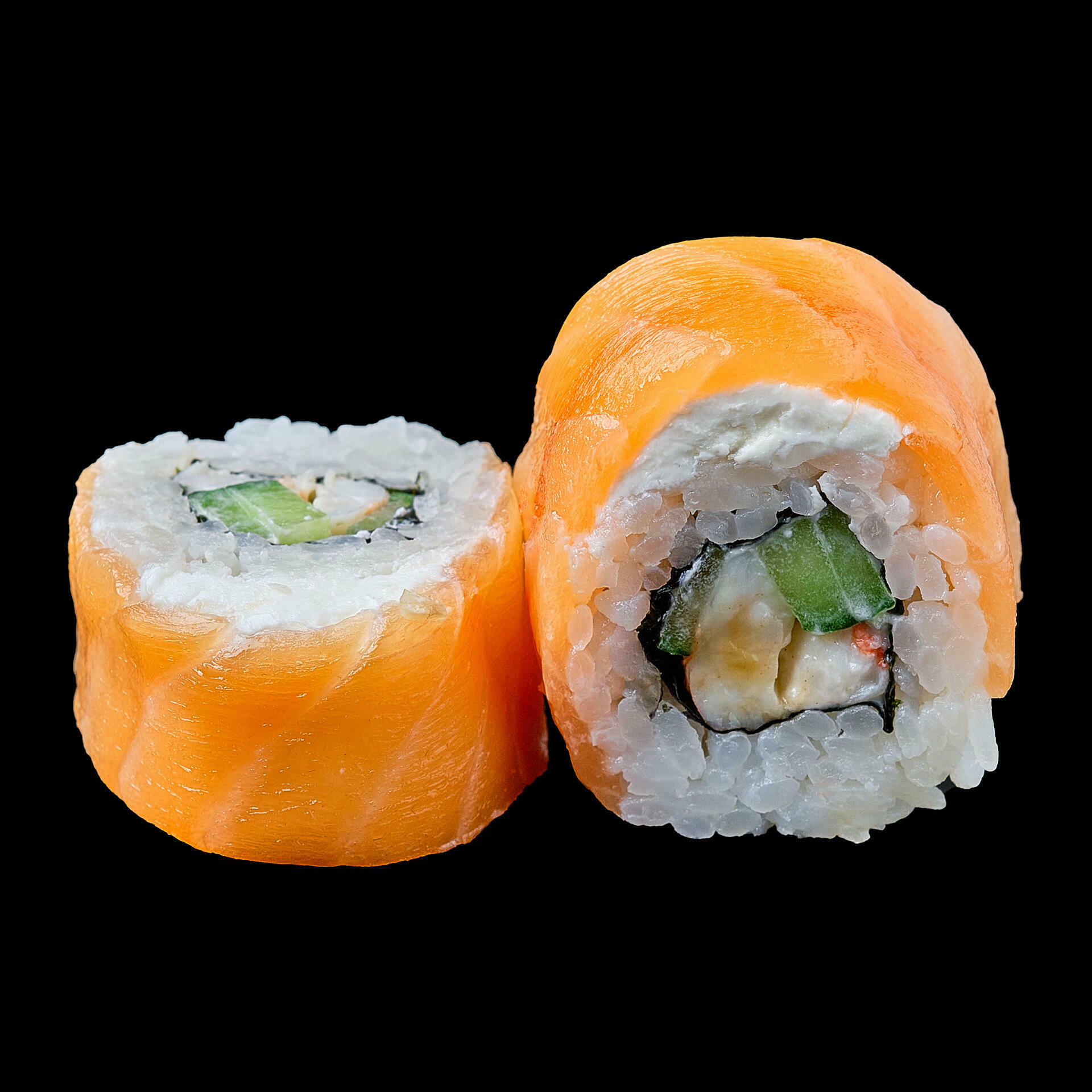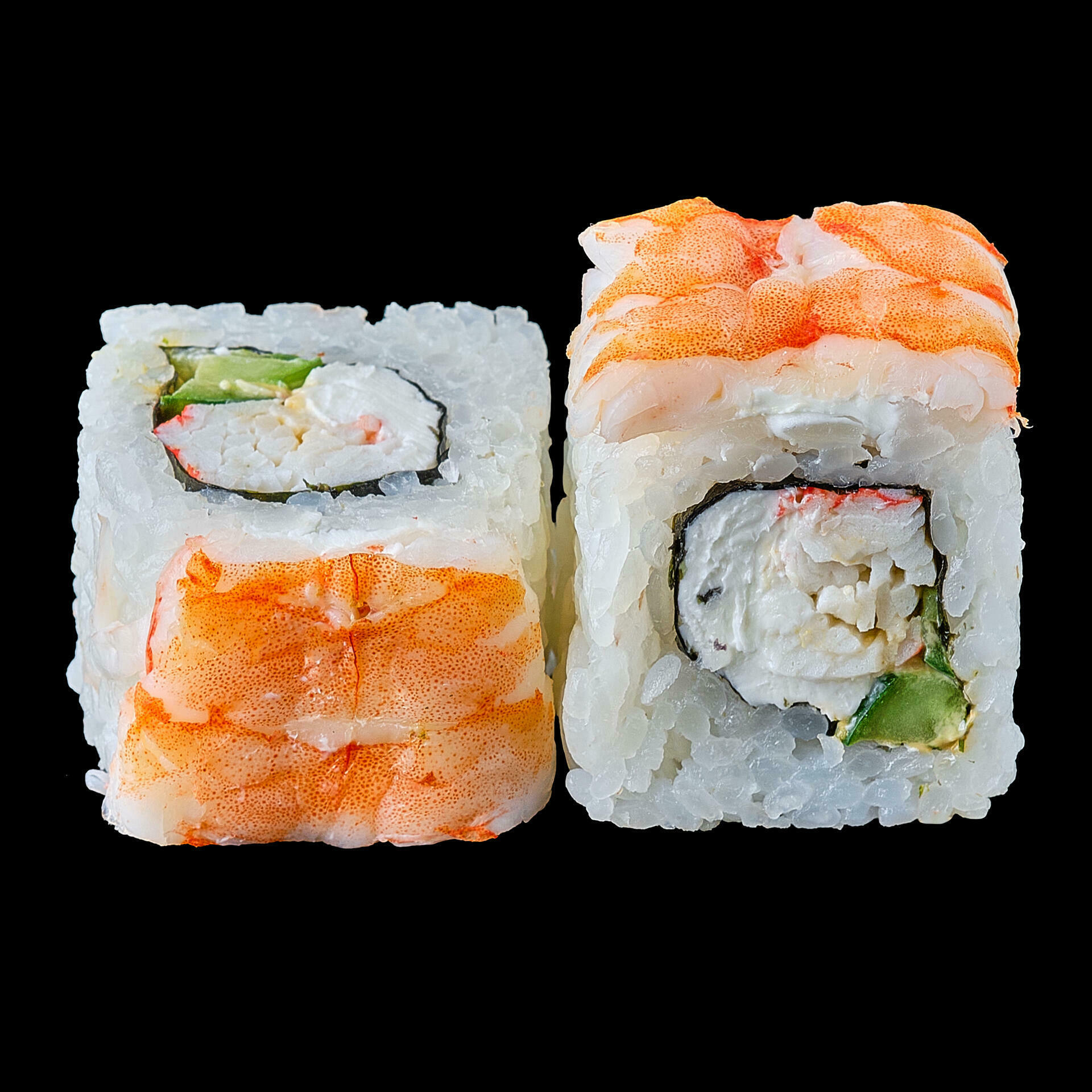 Креветка, сливочный сыр, огурец, тобико, кунжут, соус из лосося и сыра.