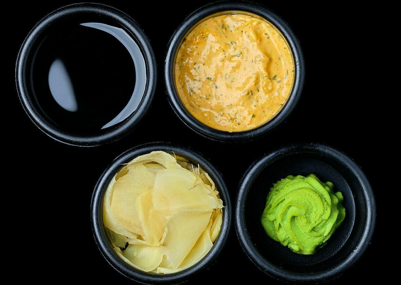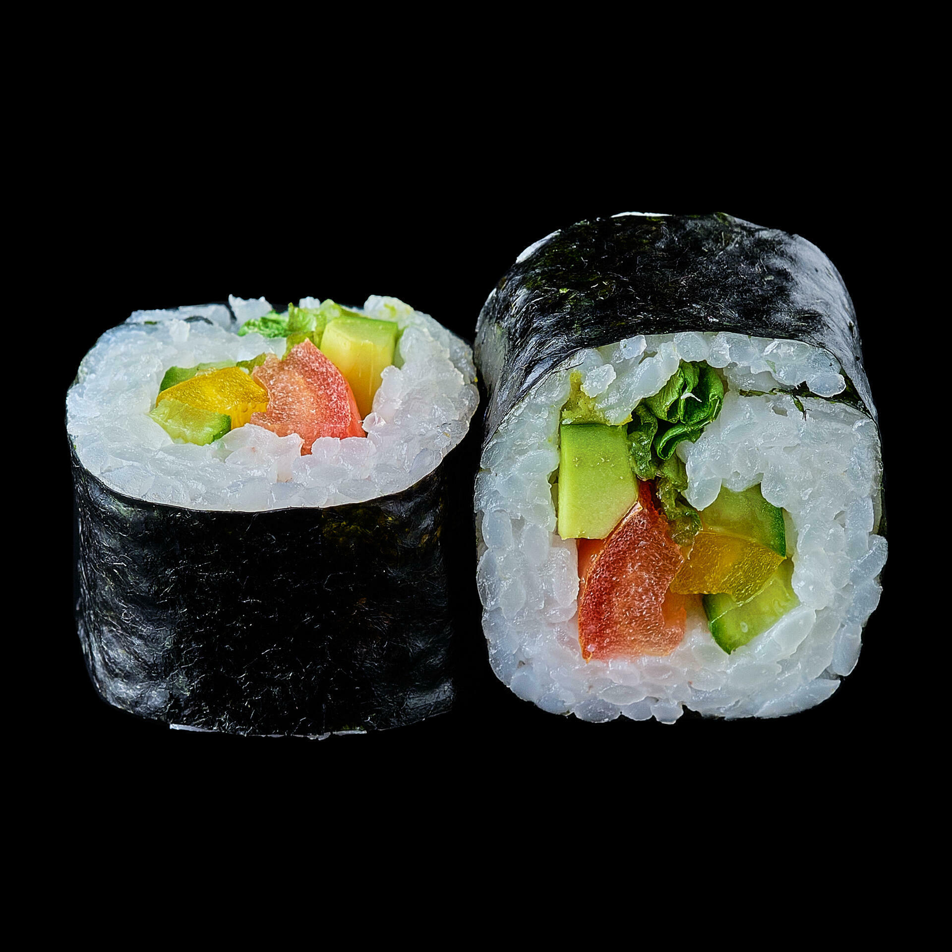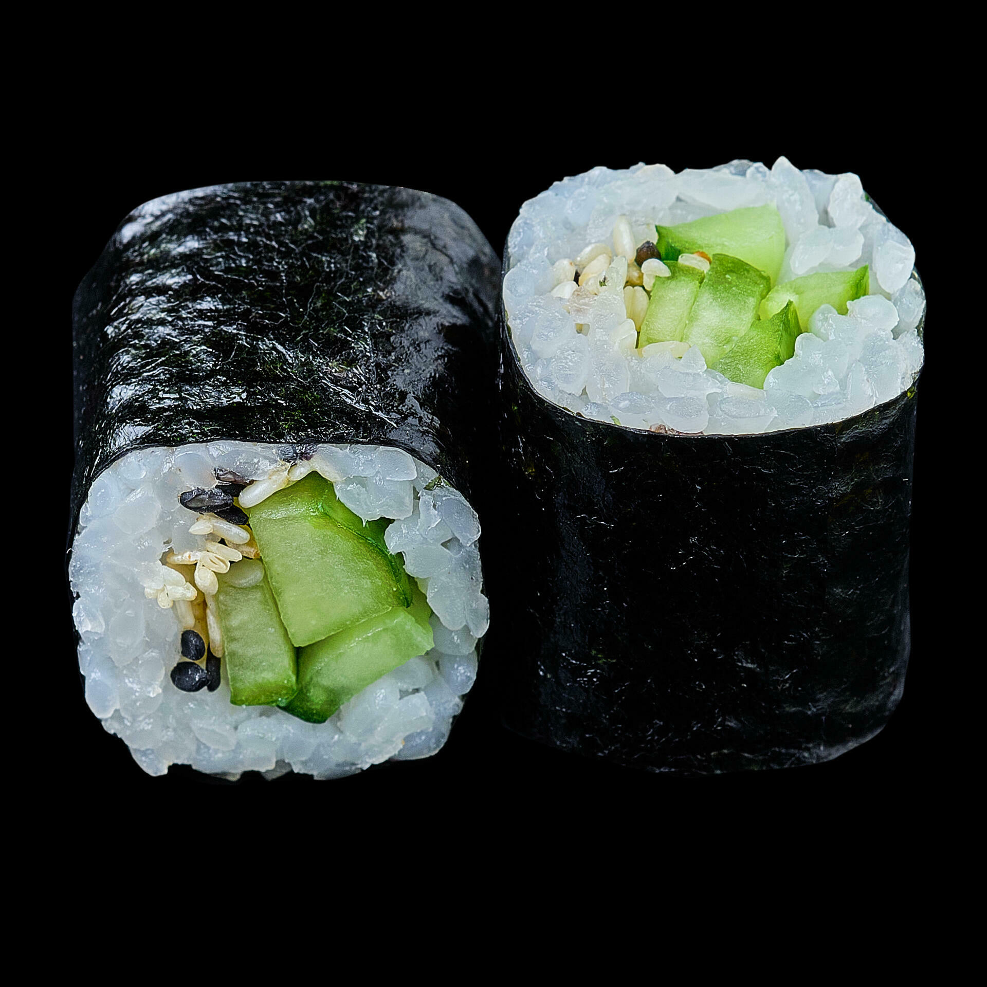 Рис, лосось, водоросли Чука, огурцы, ростки сои, бобы Эдамаме, авокадо, соус Ким чи