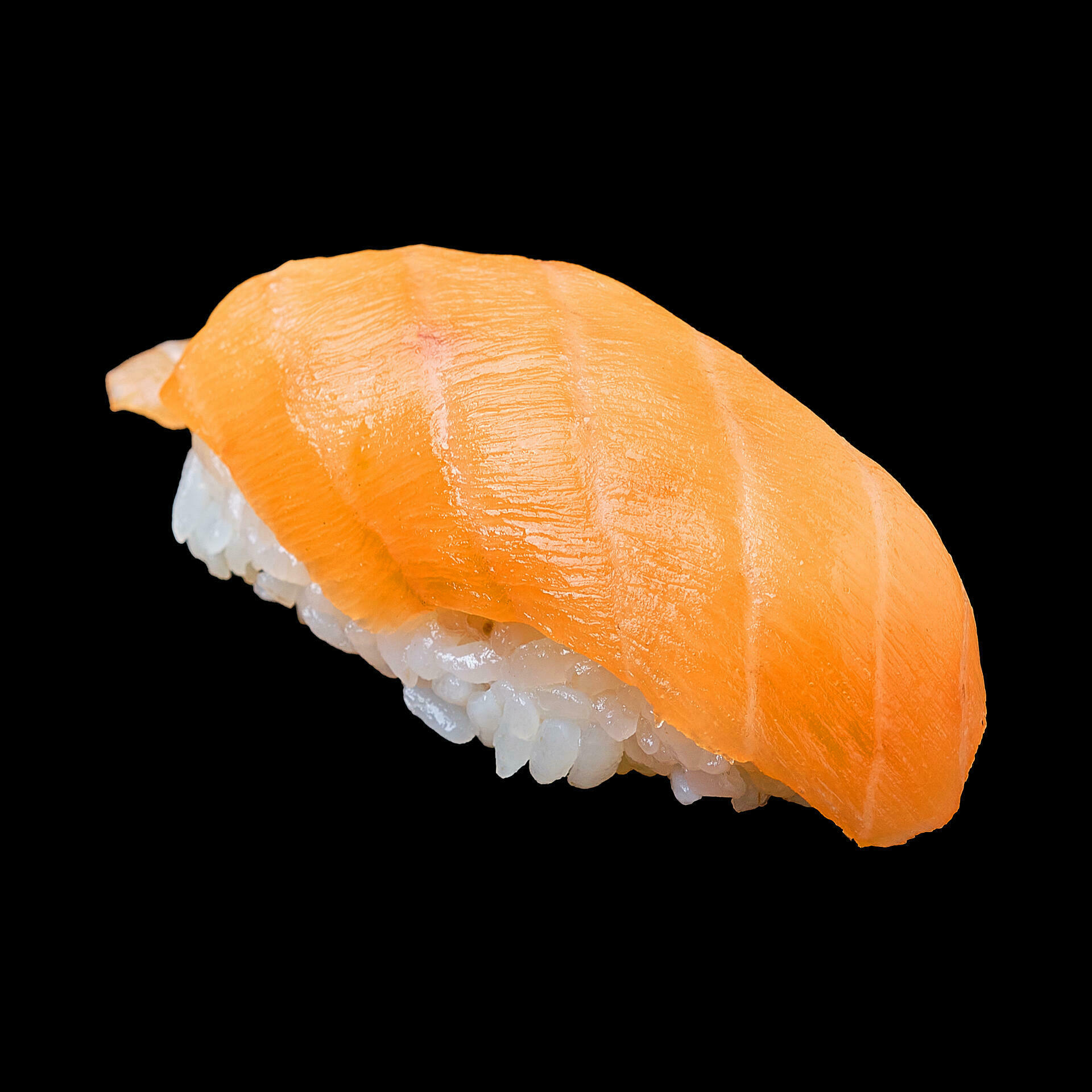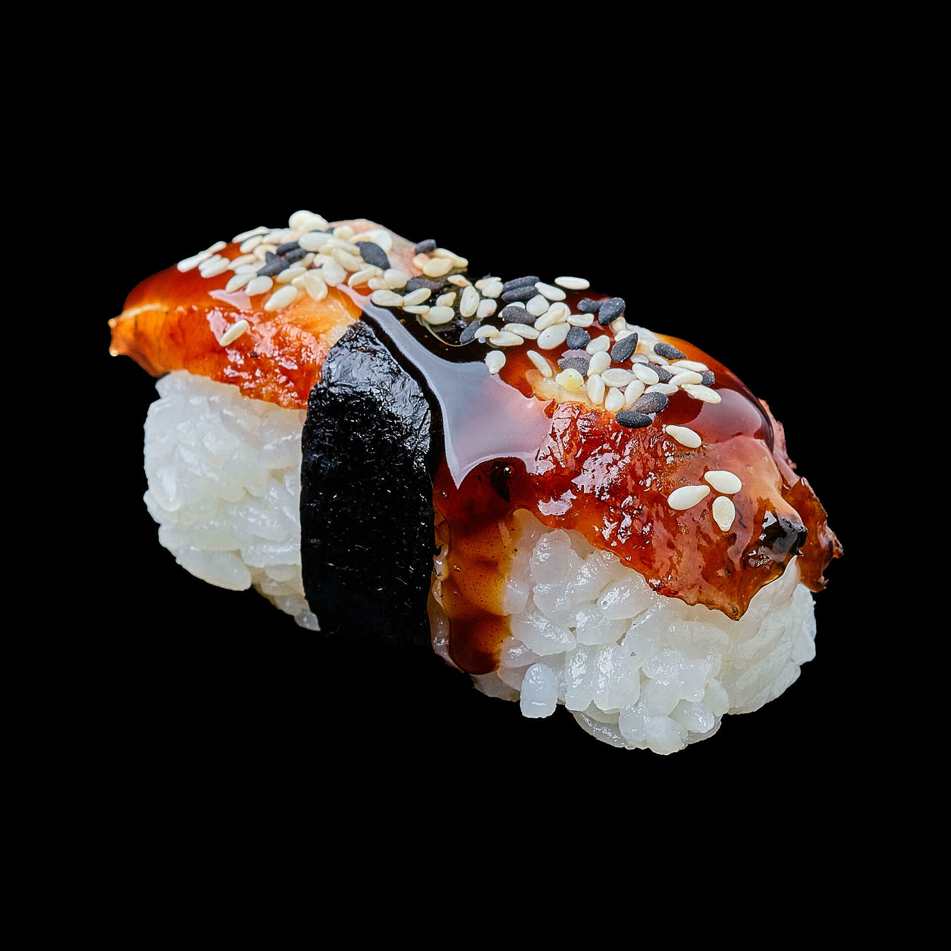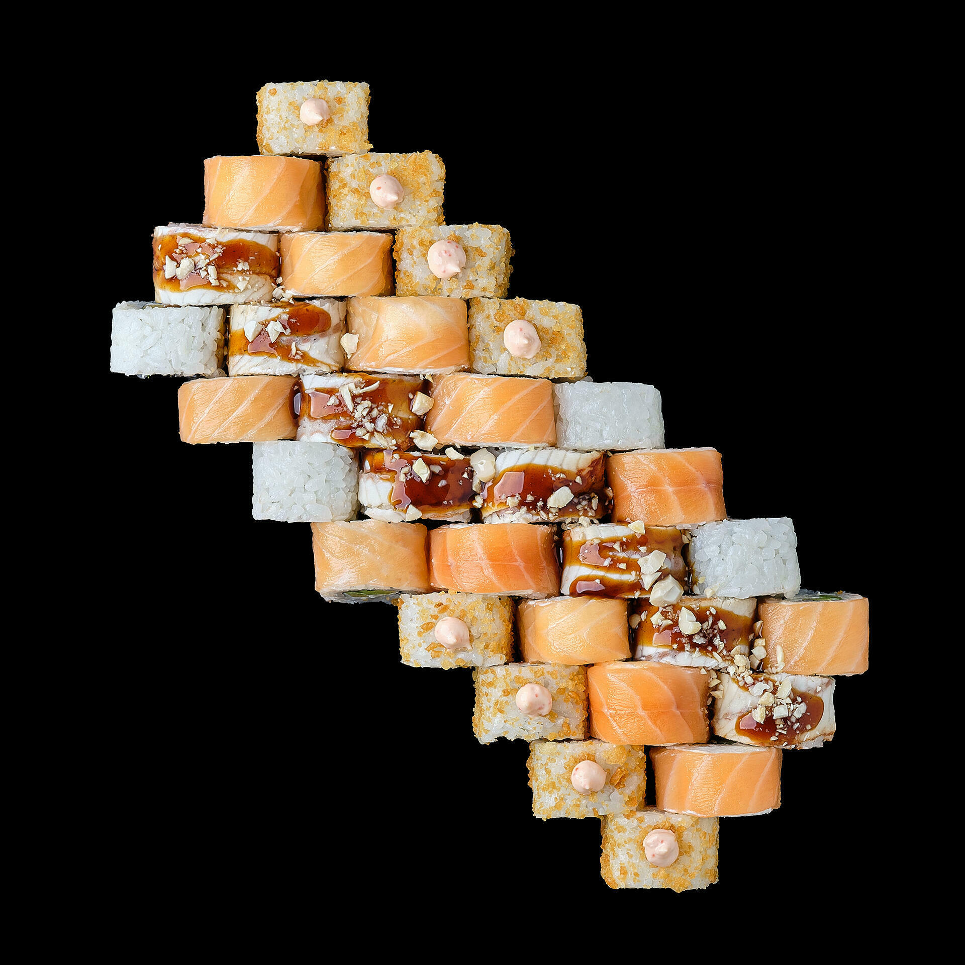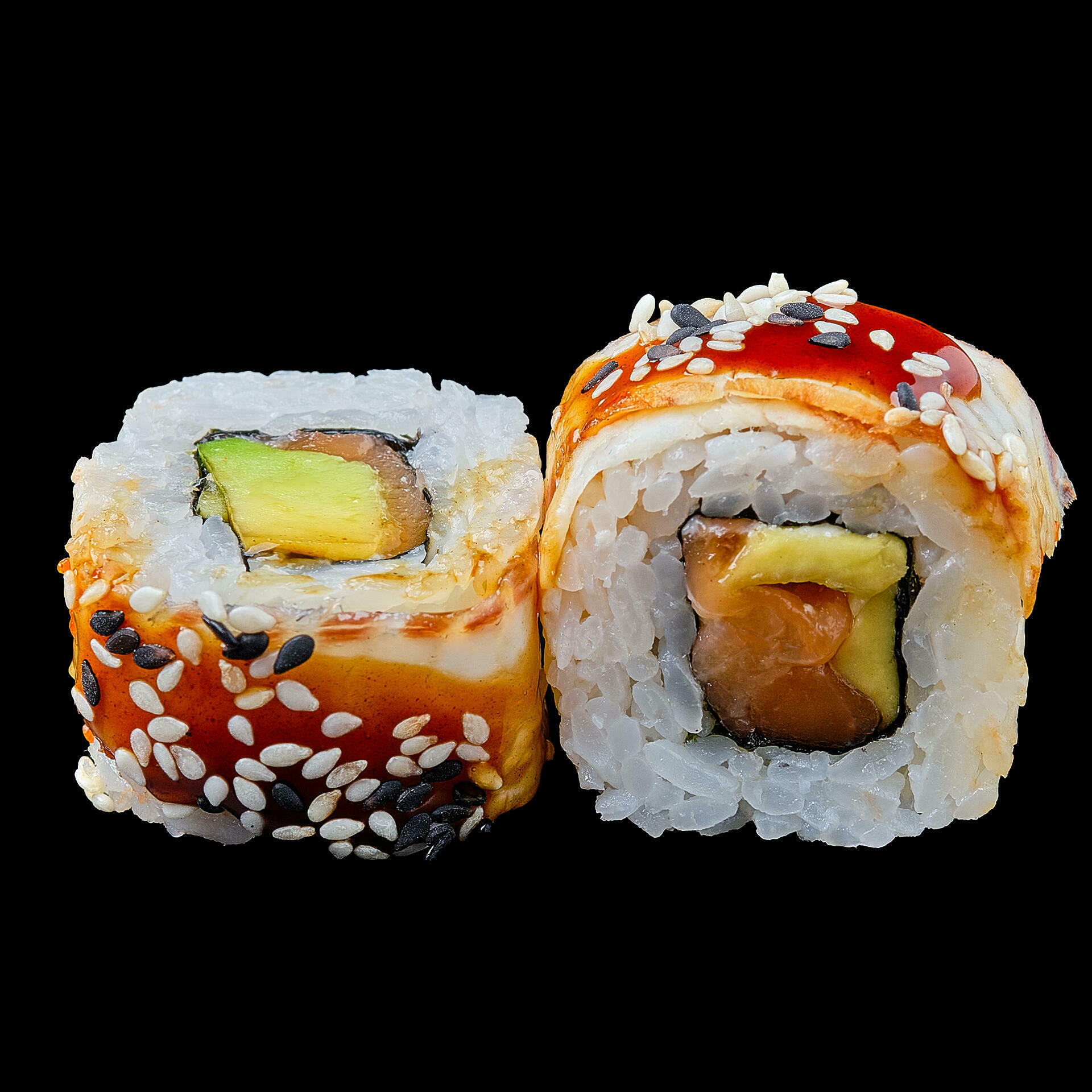 Ролл с копченым угрем, нежным лососем, авокадо, японским майонезом, кунжутом и соусом терияки
