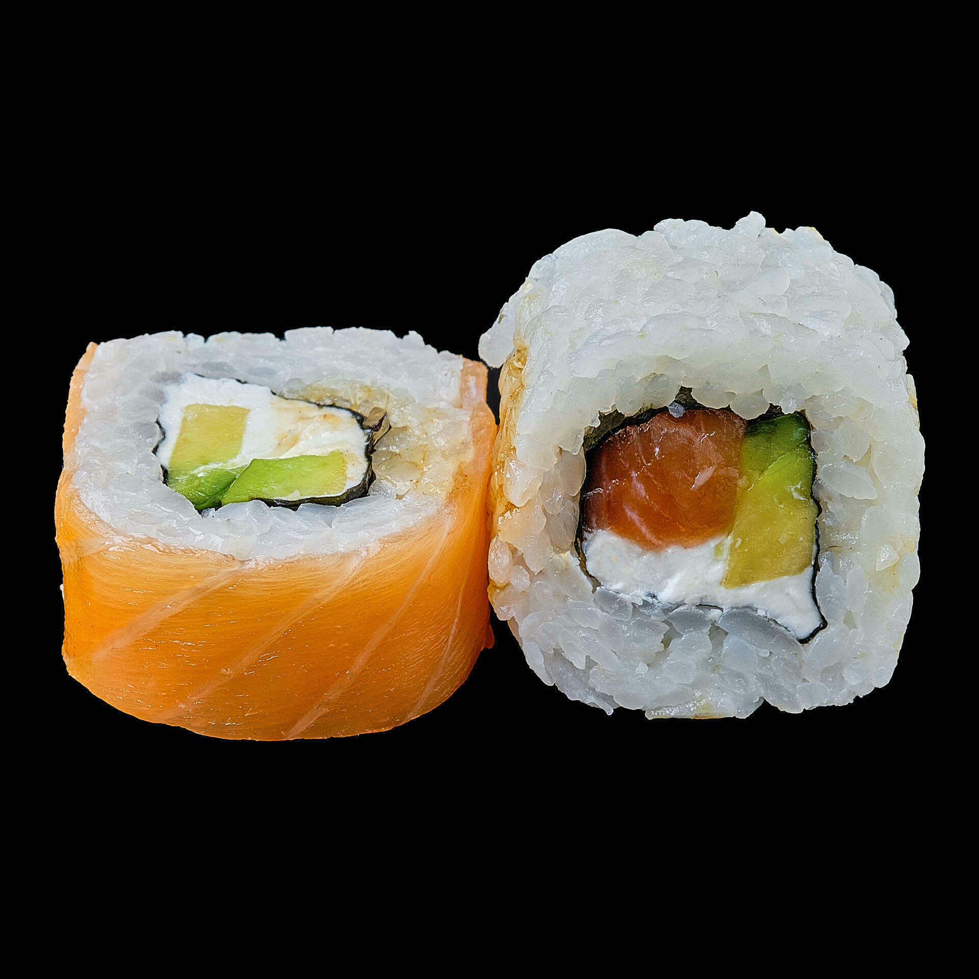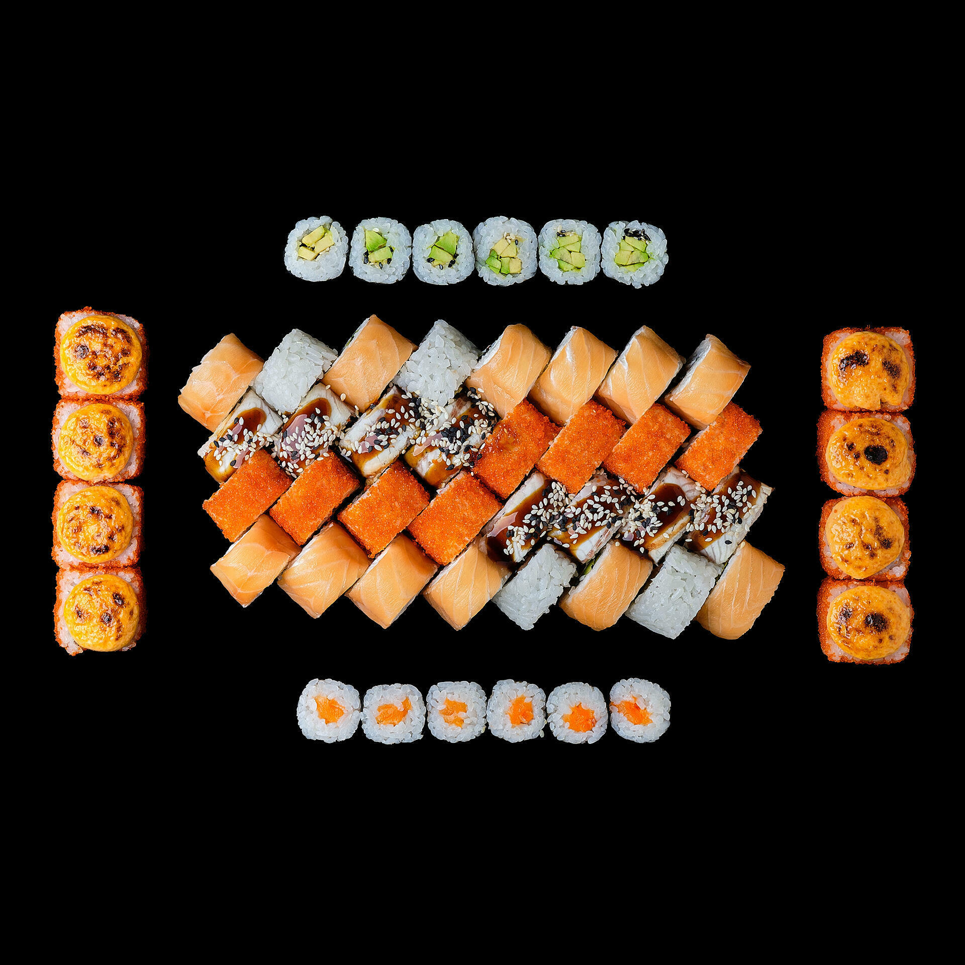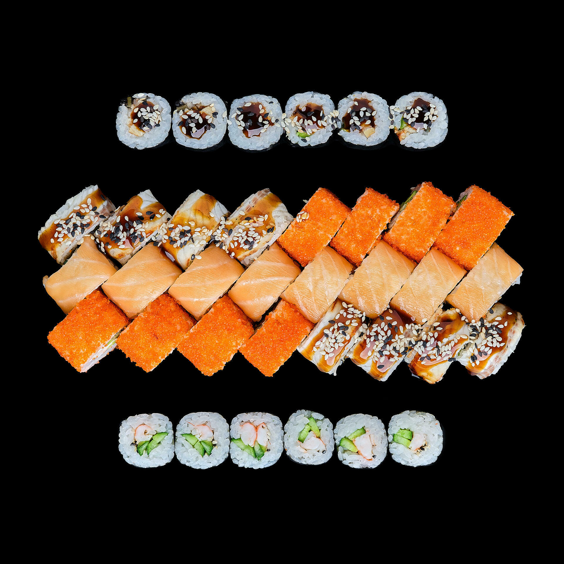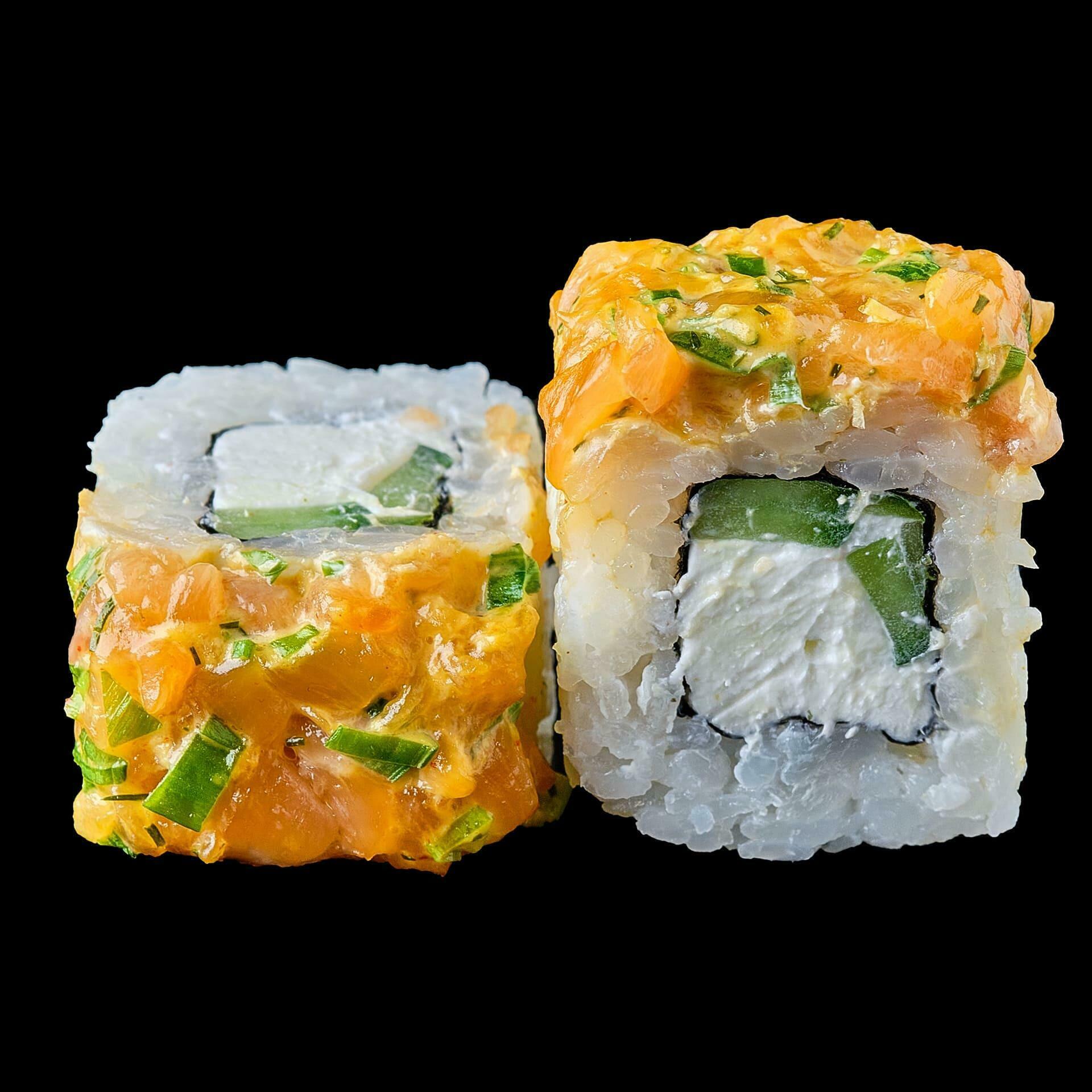 С угрем и лососем, острым соусом, с икрой тобико и сыром филадельфия с огурцом