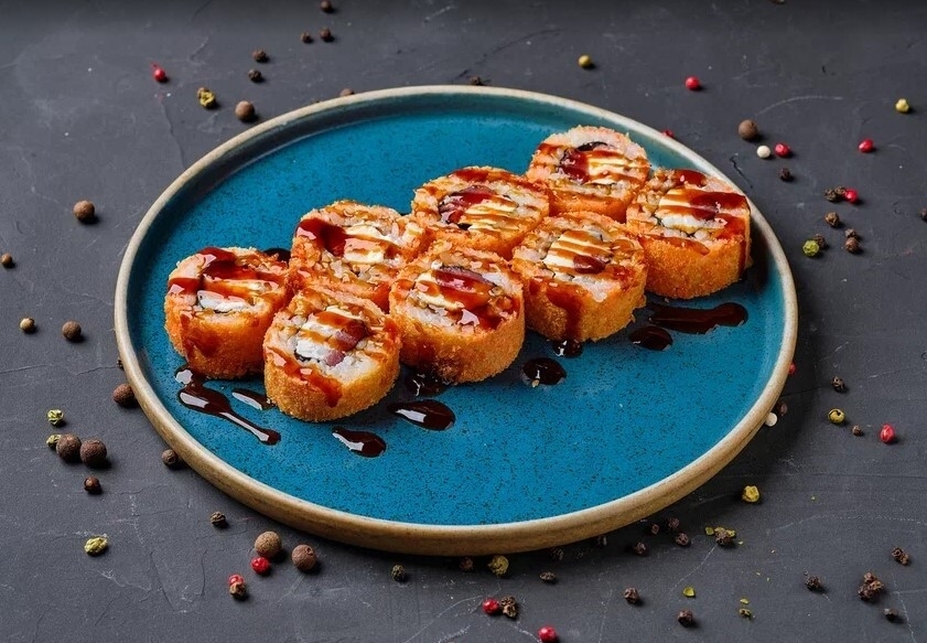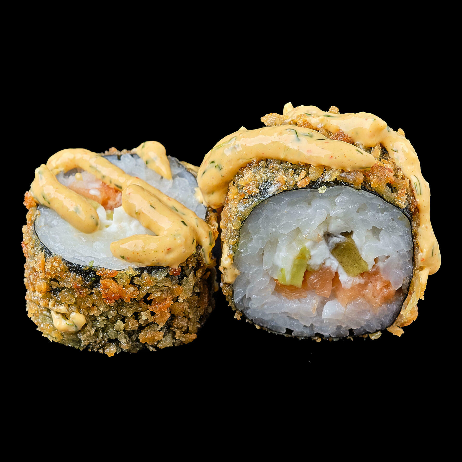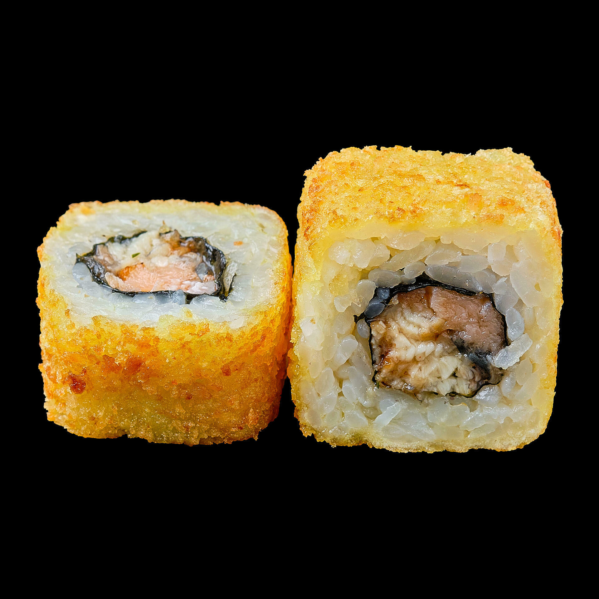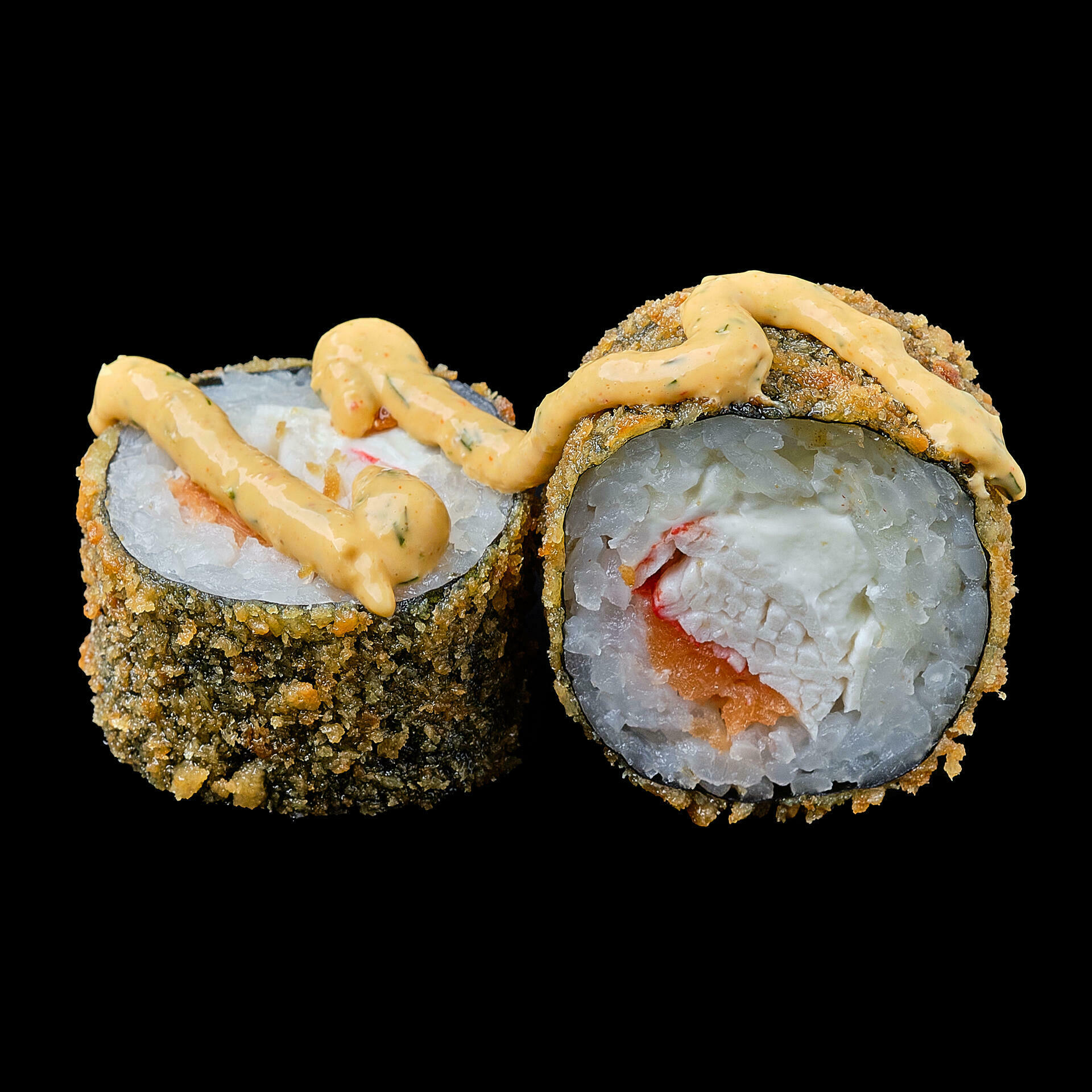 Теплый ролл с угрем, лососем и соусом спайс, обжаренный в панировочных сухарях во фритюре