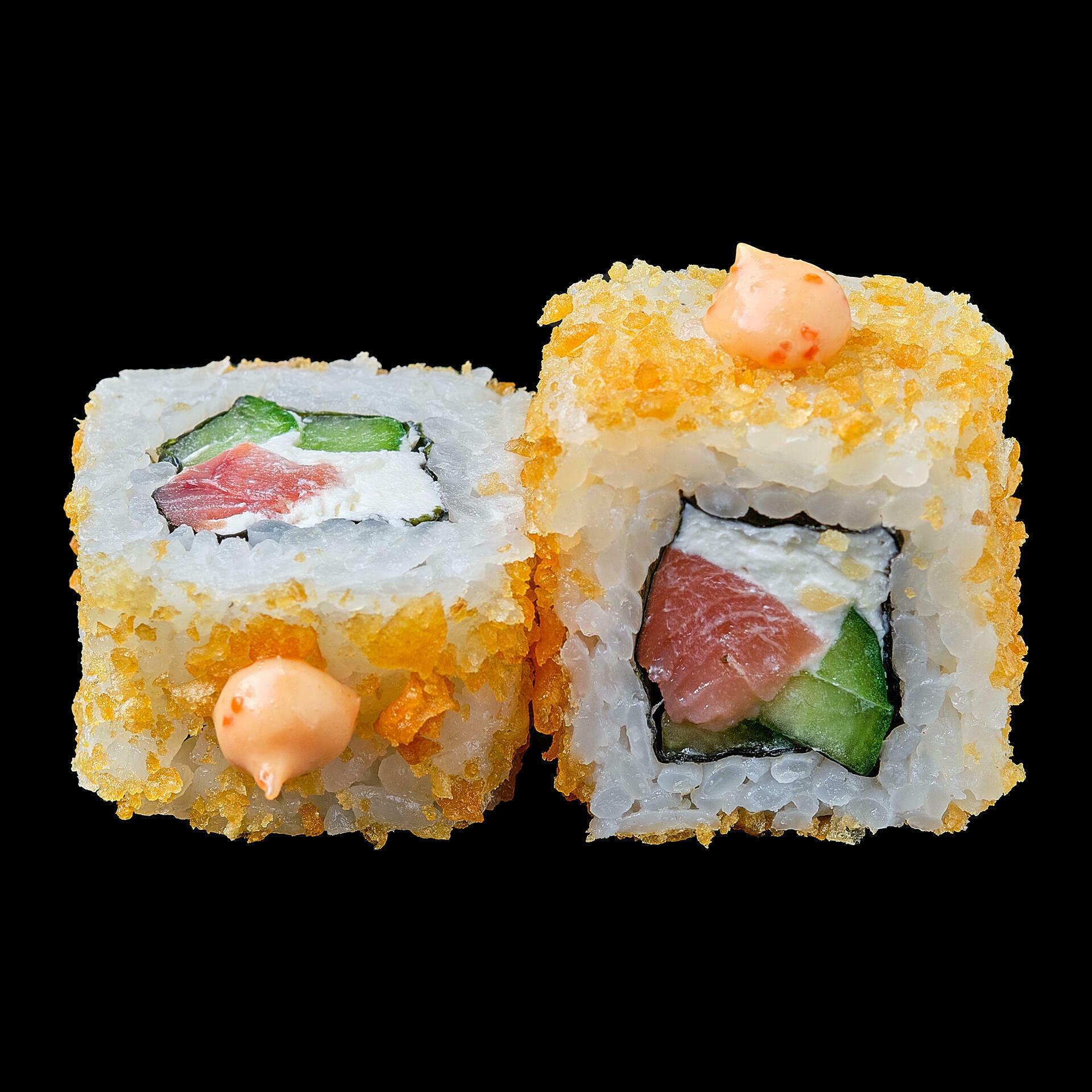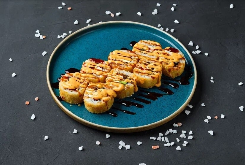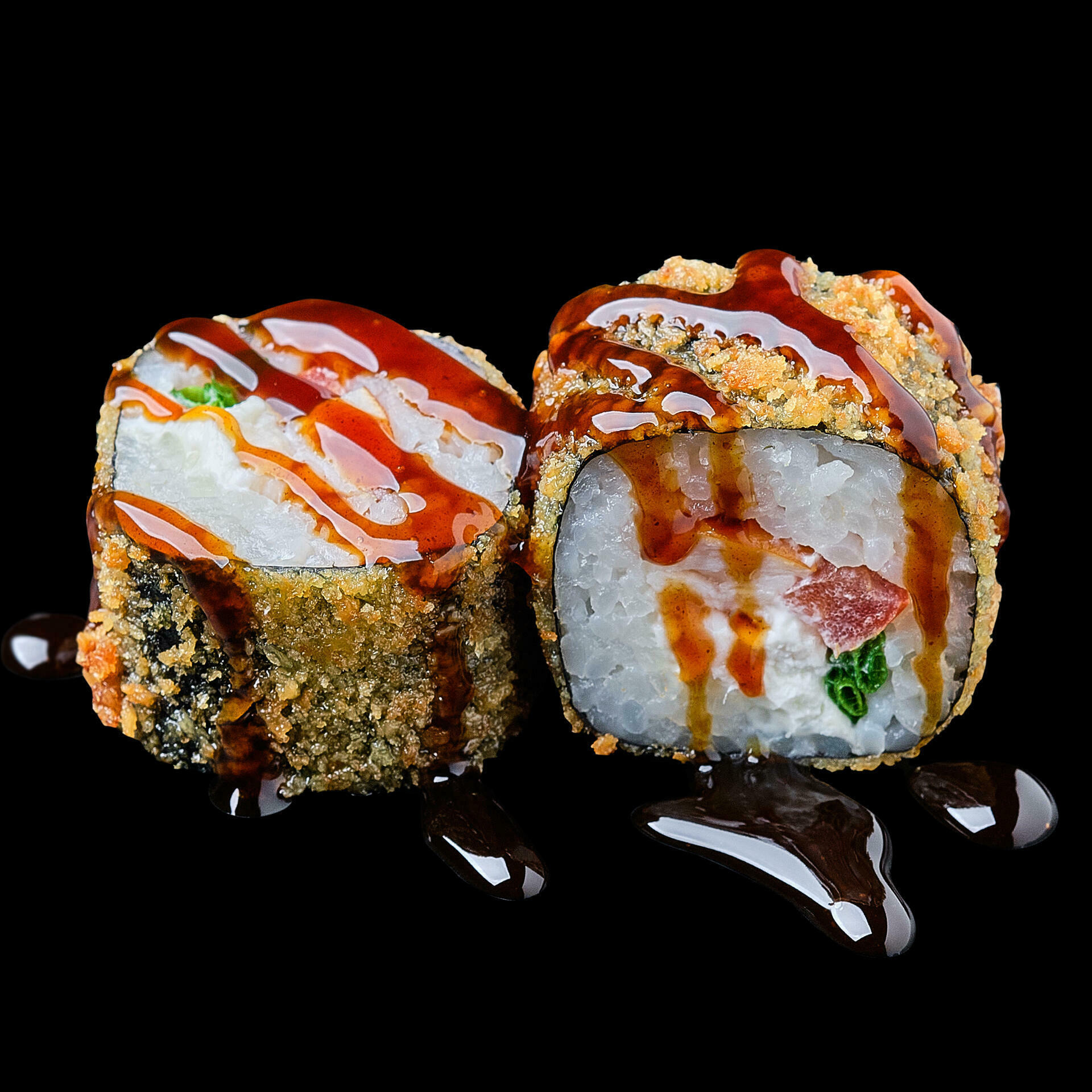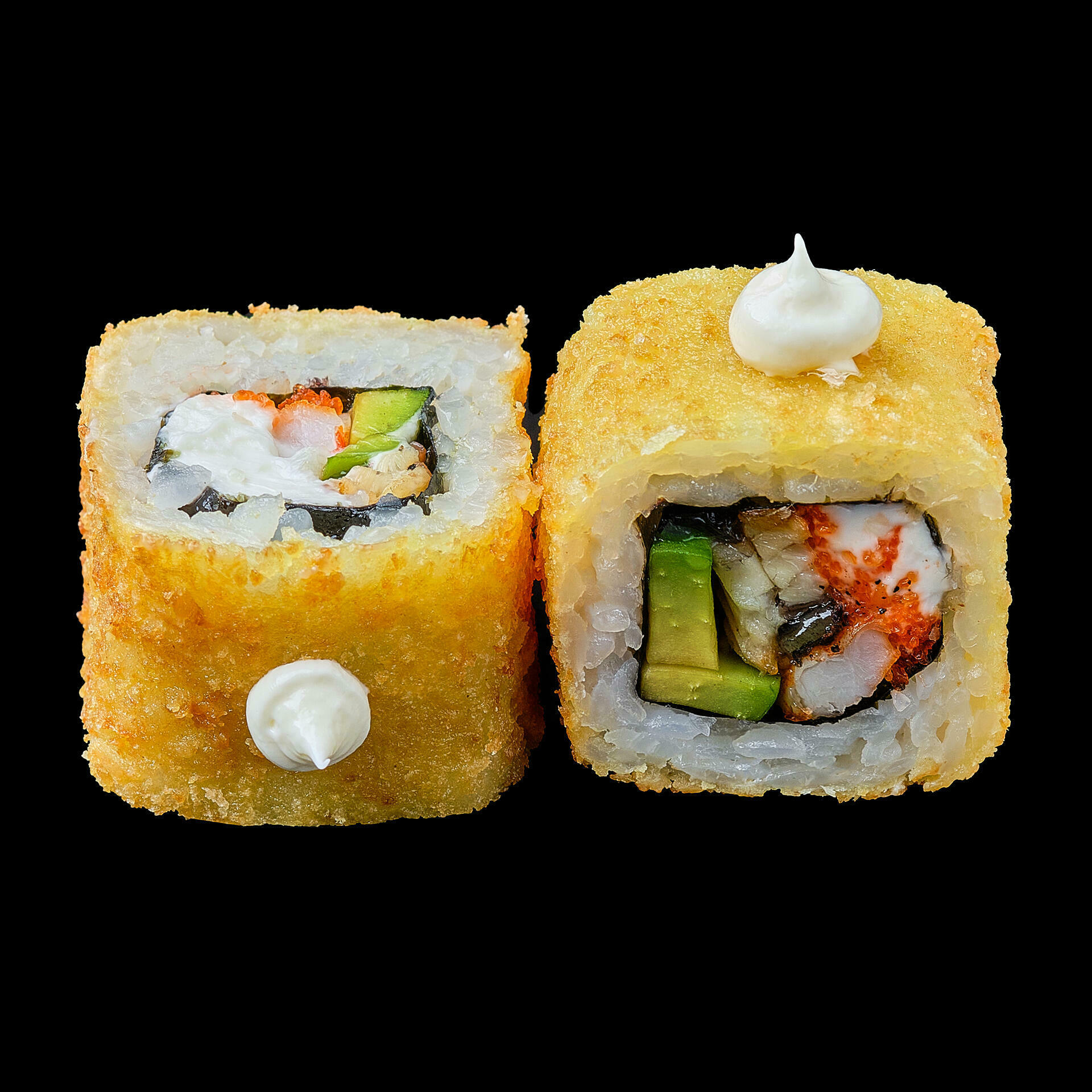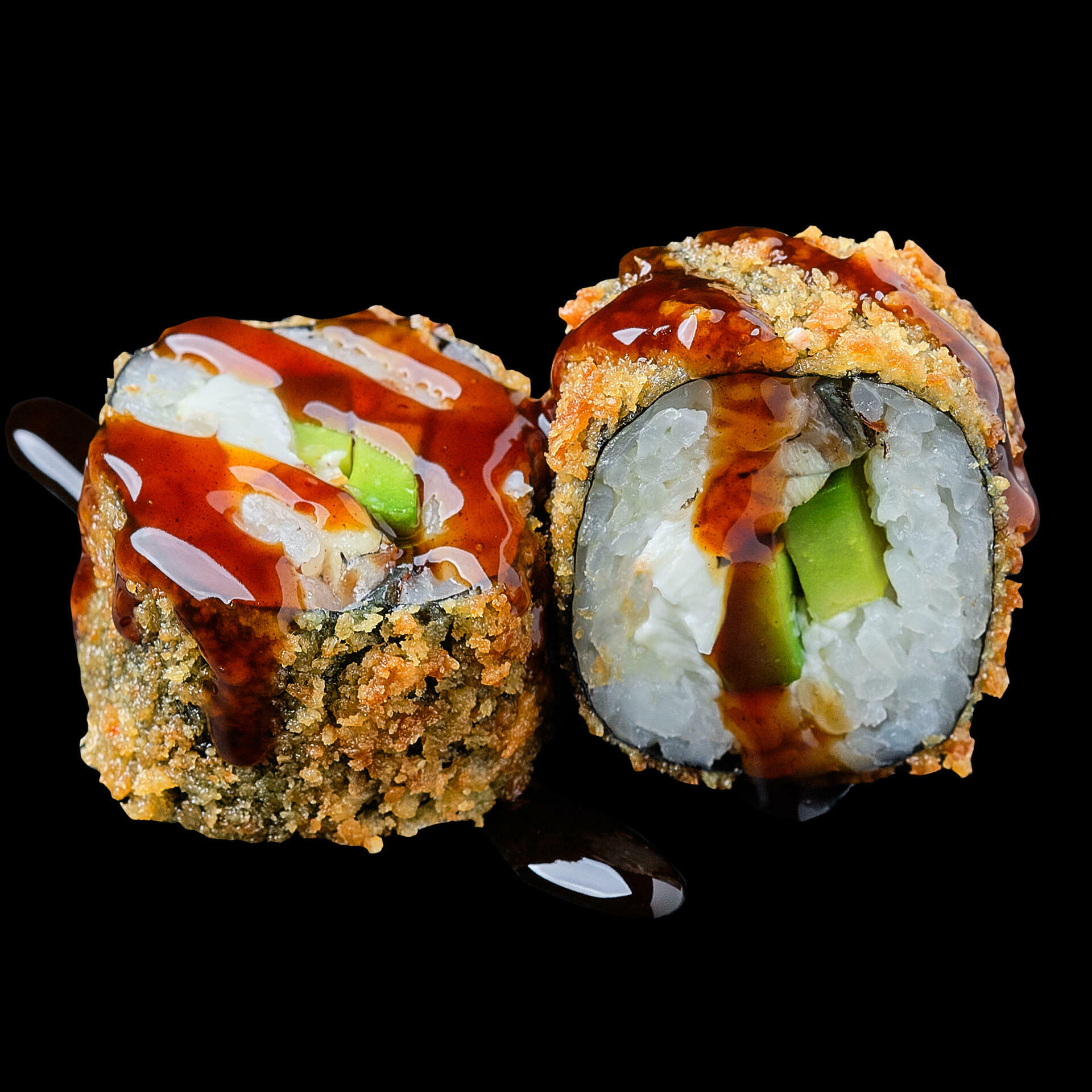 Теплый ролл с угрем, лососем и соусом спайс, обжаренный в панировочных сухарях во фритюре