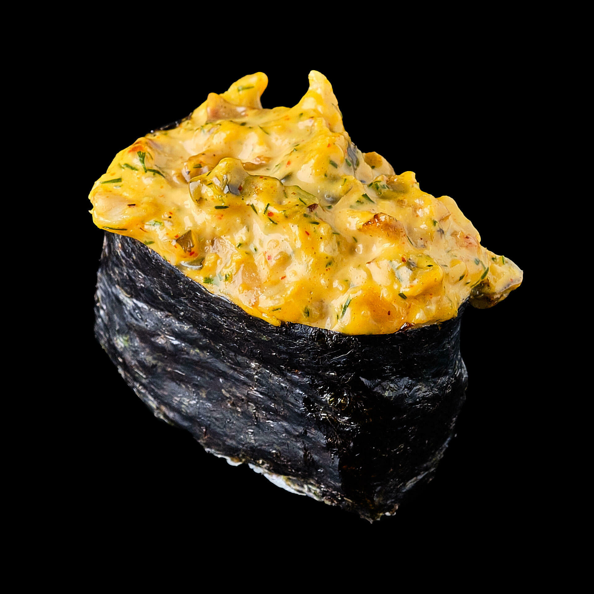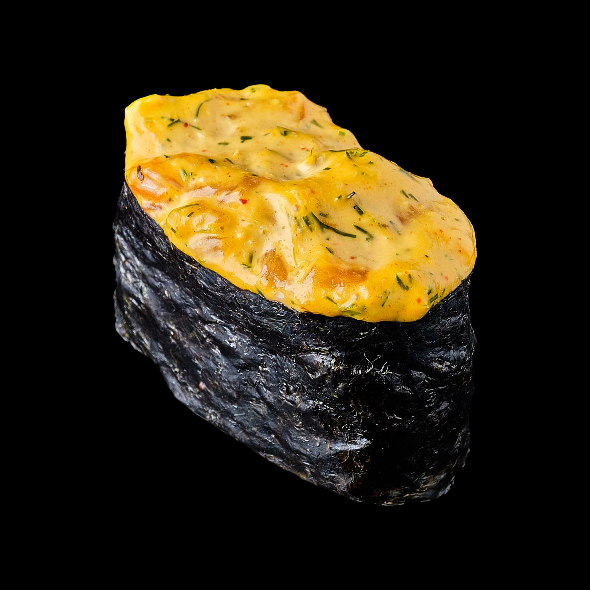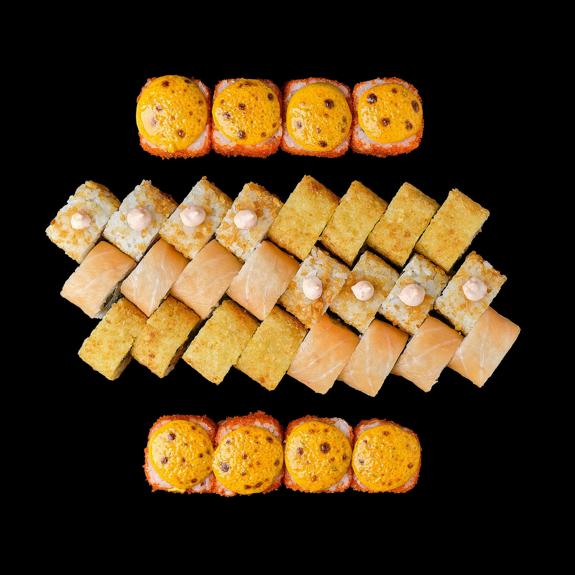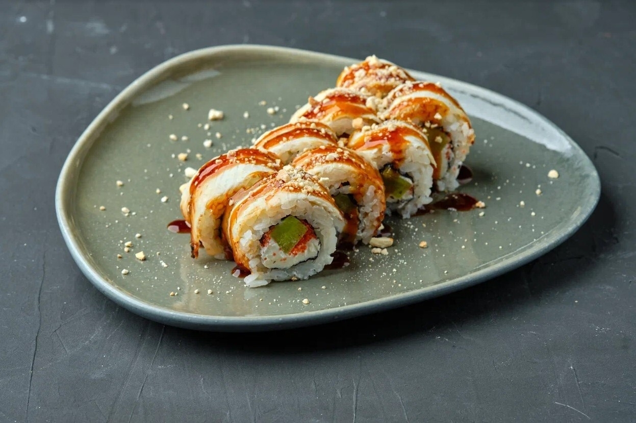 Теплый ролл с угрем, лососем и соусом спайс, обжаренный в панировочных сухарях во фритюре