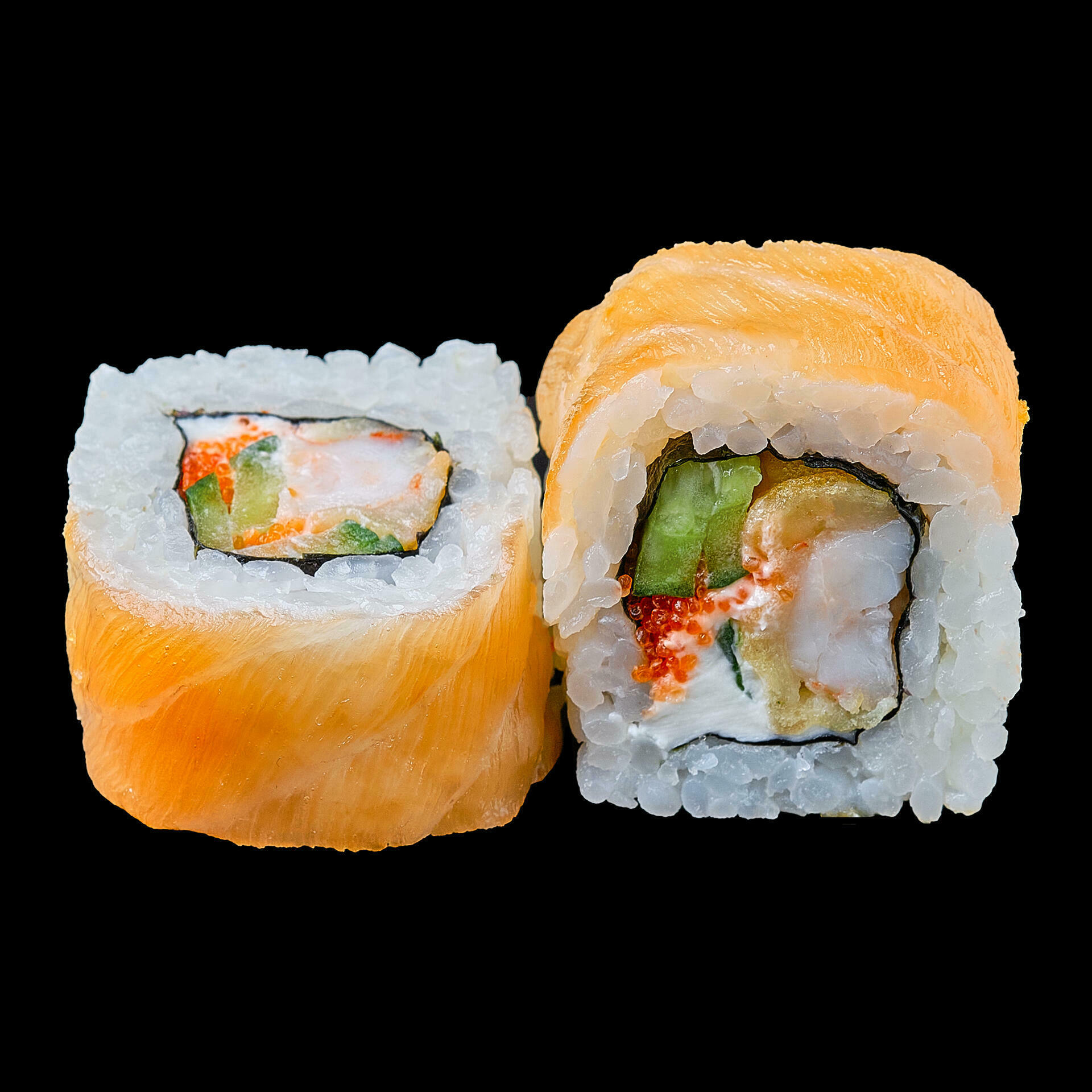 Тигровая креветка в кляре, лосось, сливочный сыр, огурец, икра тобико