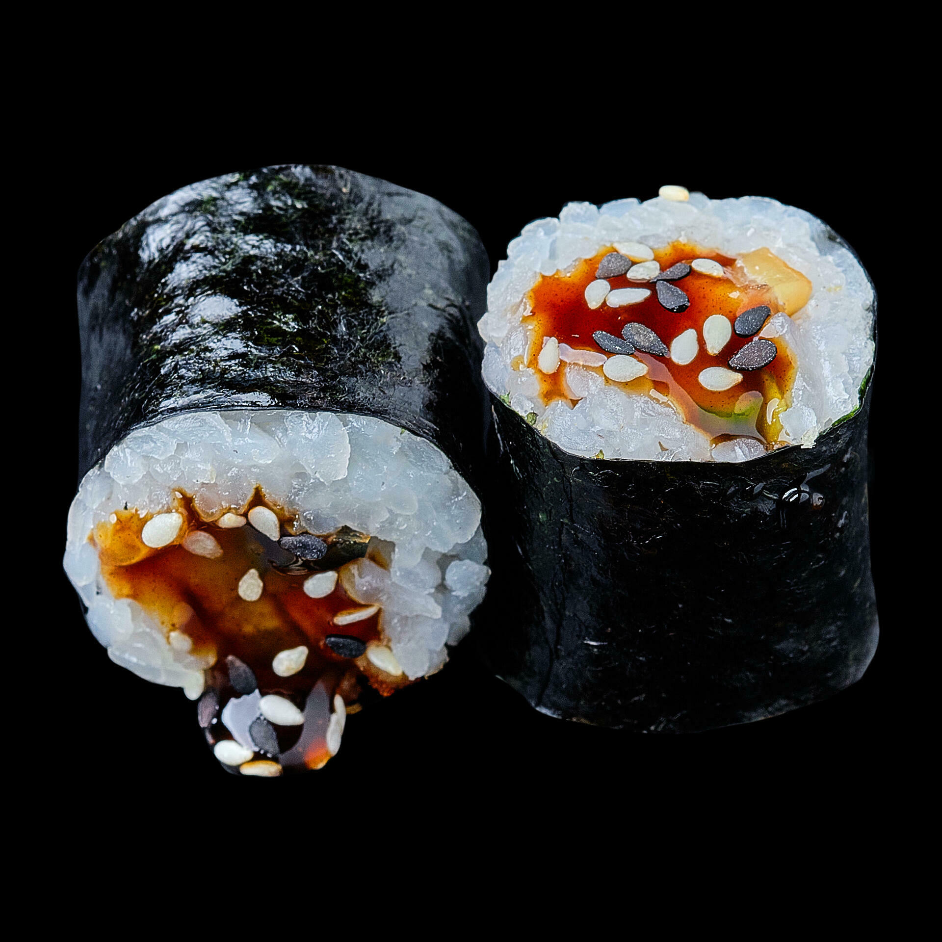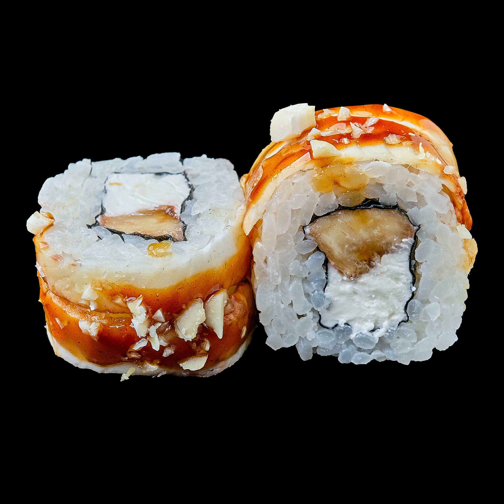 С копченым угрем, бананом, сливочным сыром, с добавлением соуса терияки и кешью