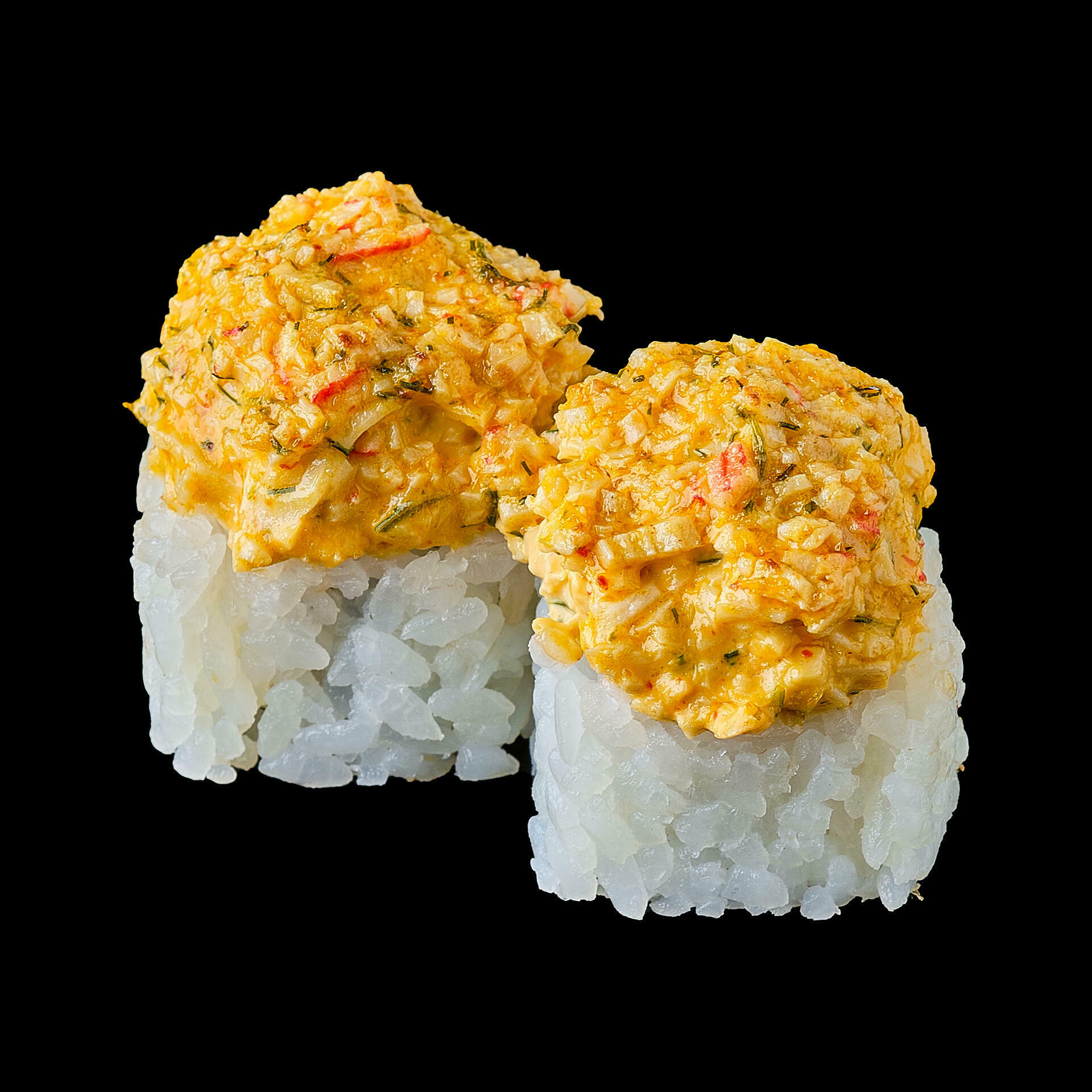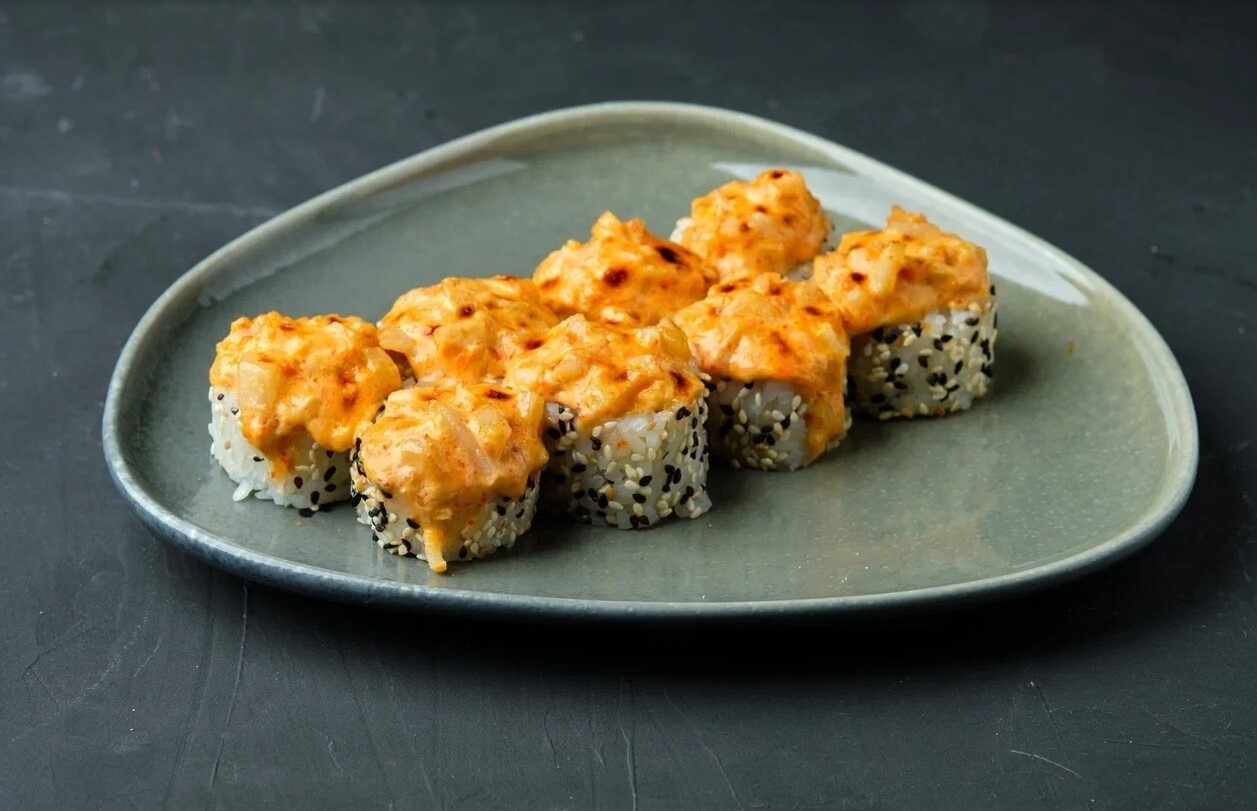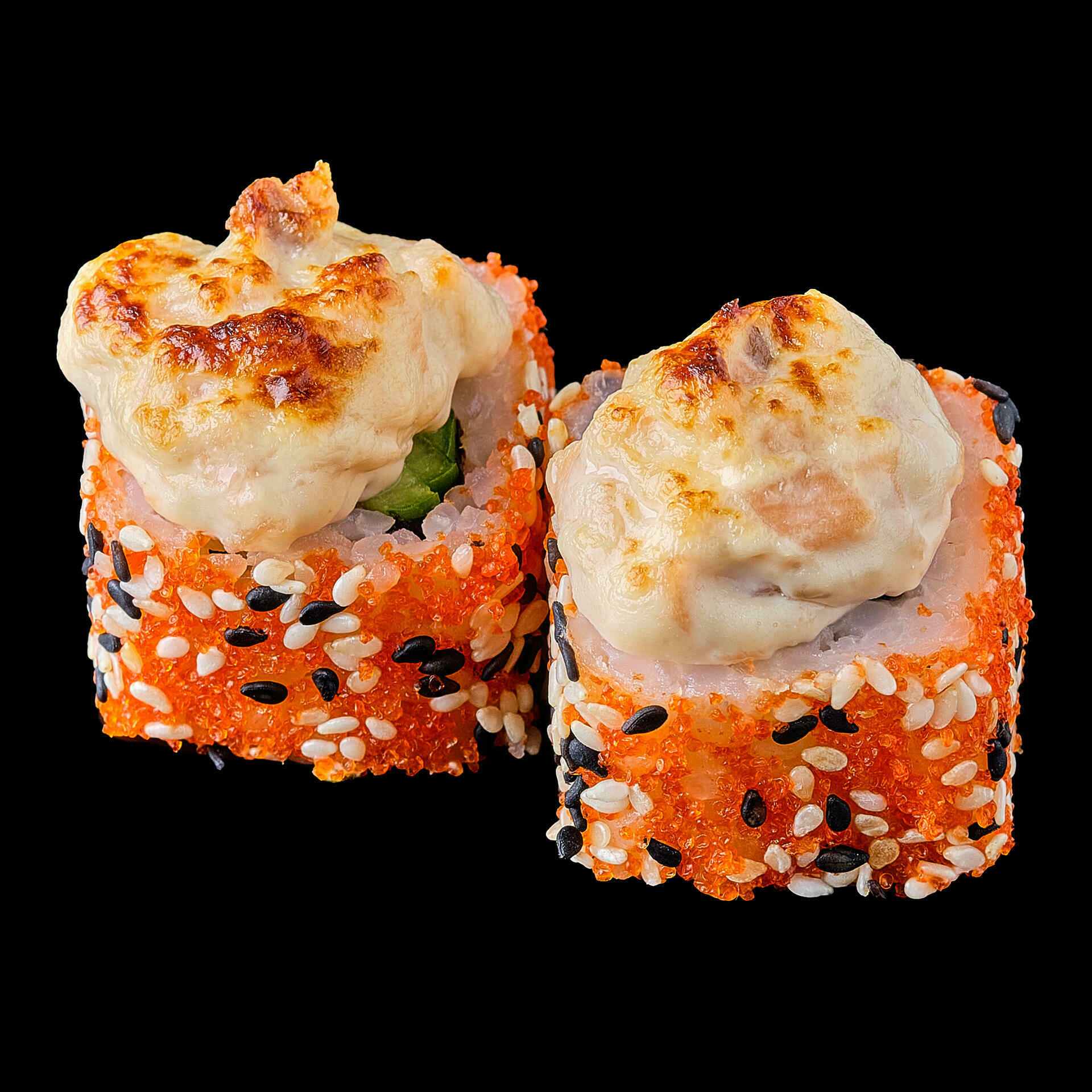 Запеченный ролл с крабом (имитация), сливочным сыром, свежим огурцом, соусом спайси