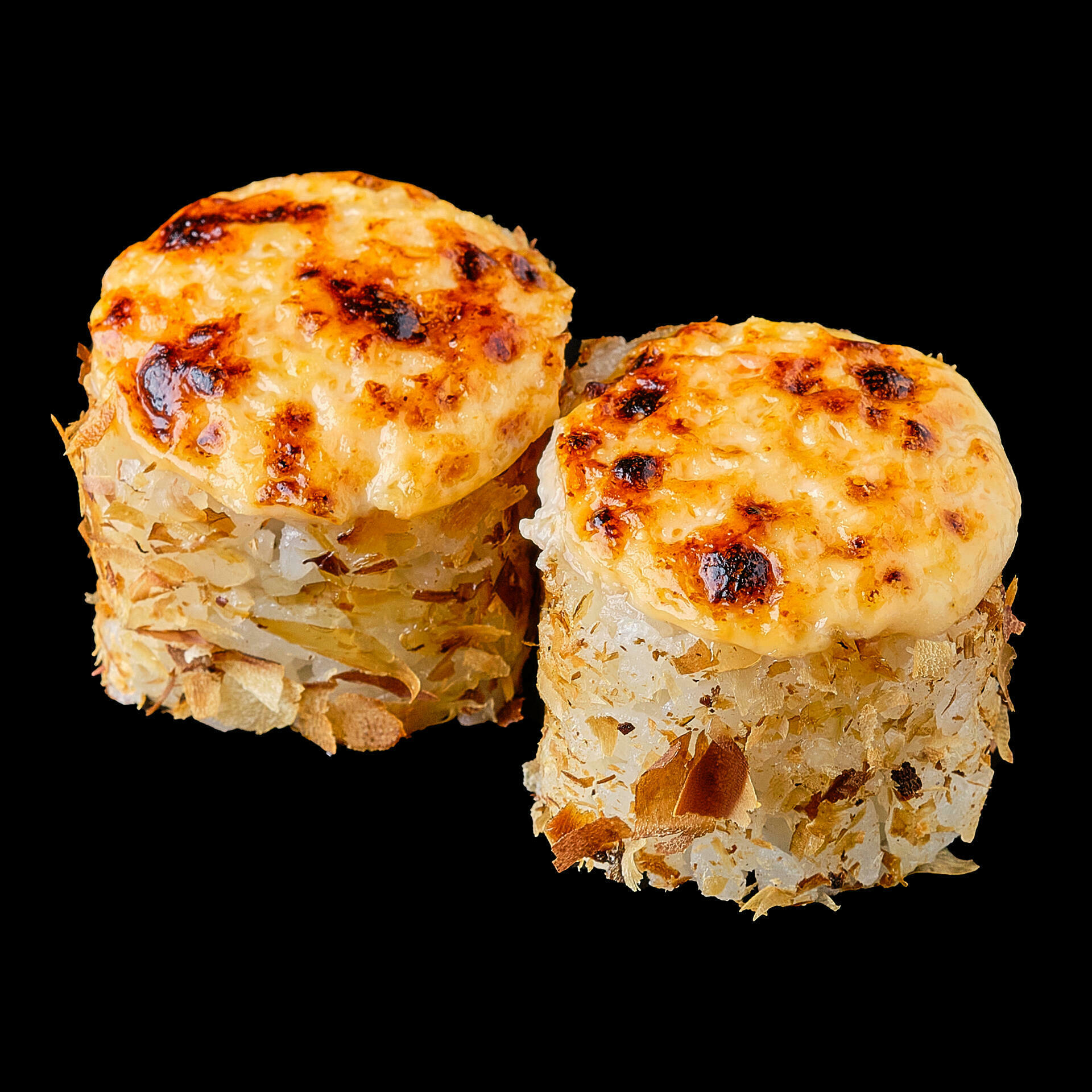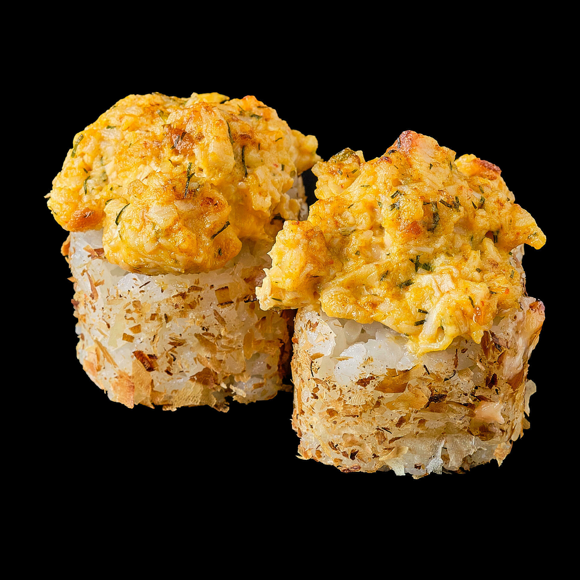 Запеченный ролл со сливочным сыром, тунцом, стружкой тунца и сырным соусом