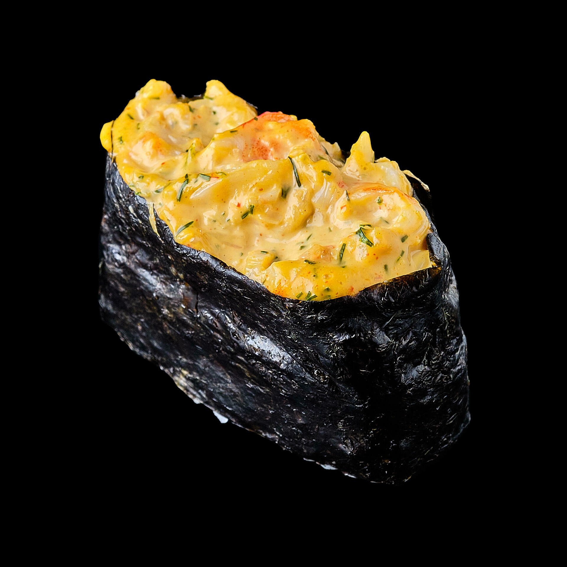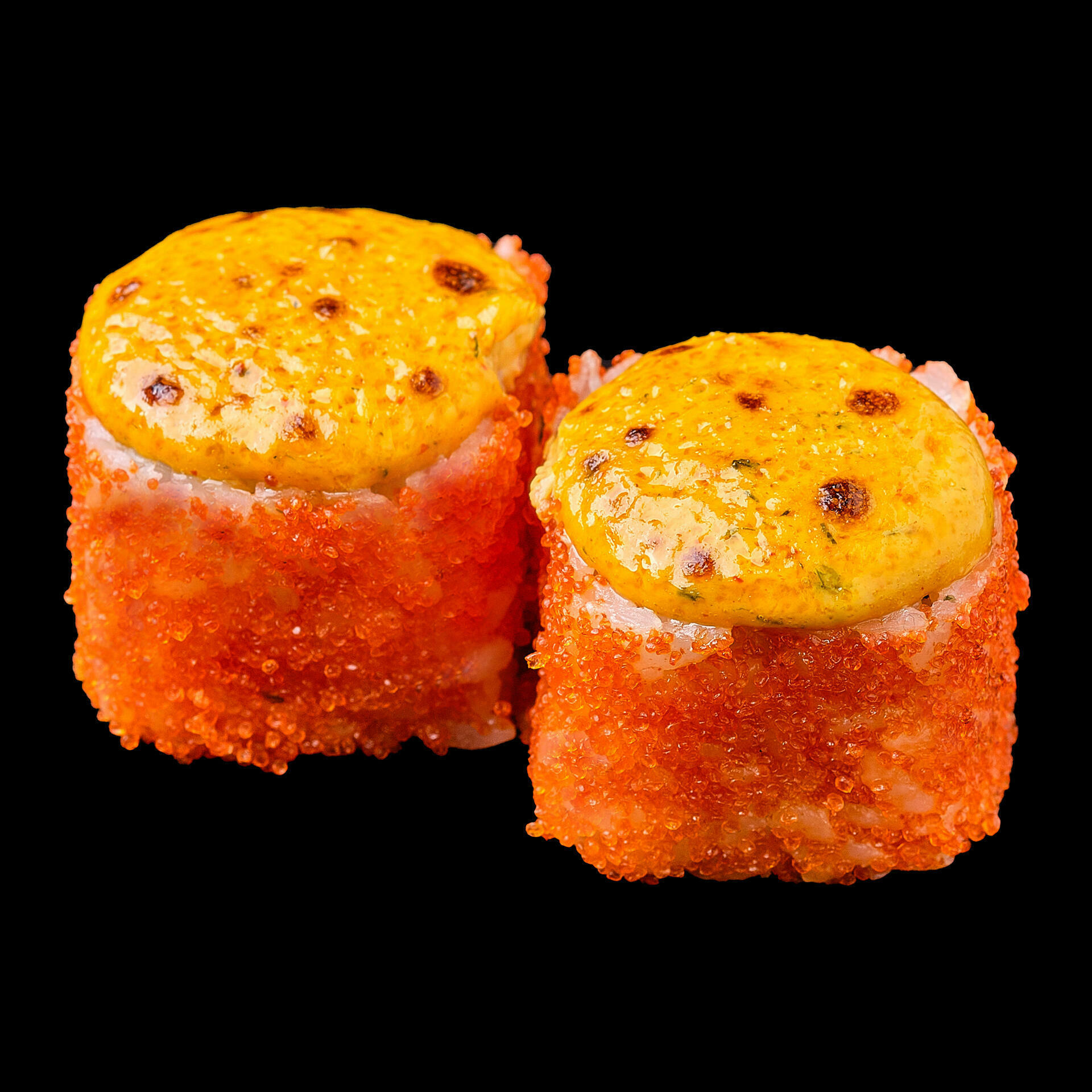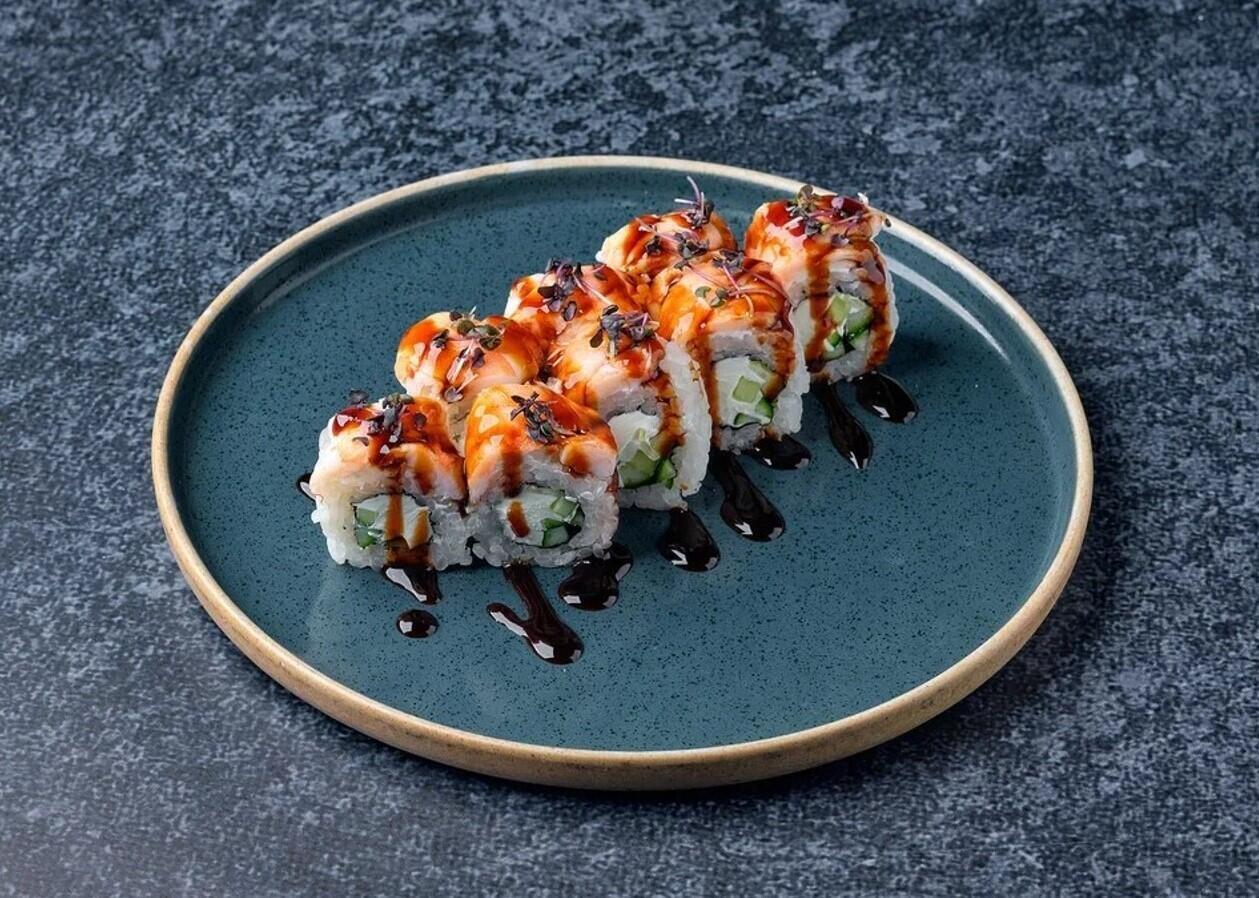Горячий ролл с тигровой креветкой, угрем, икрой тобико, авокадо, сыром филадельфия
