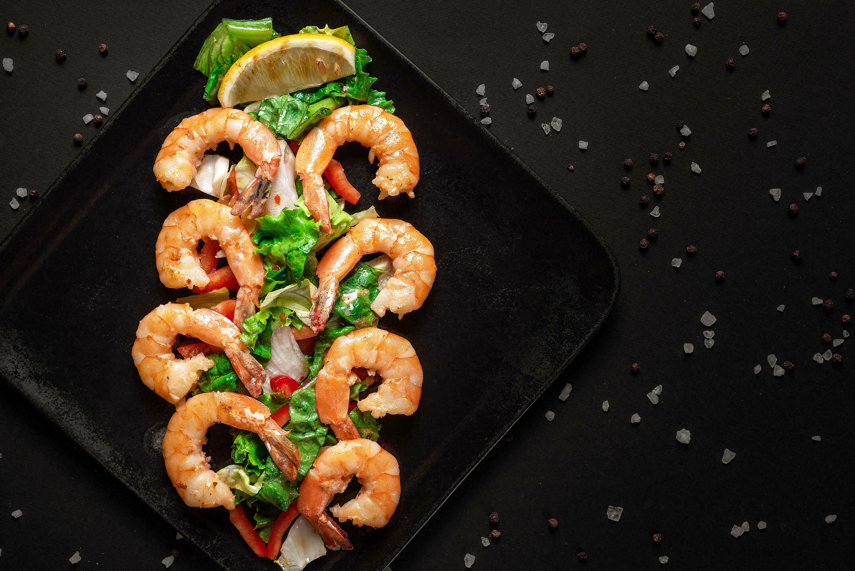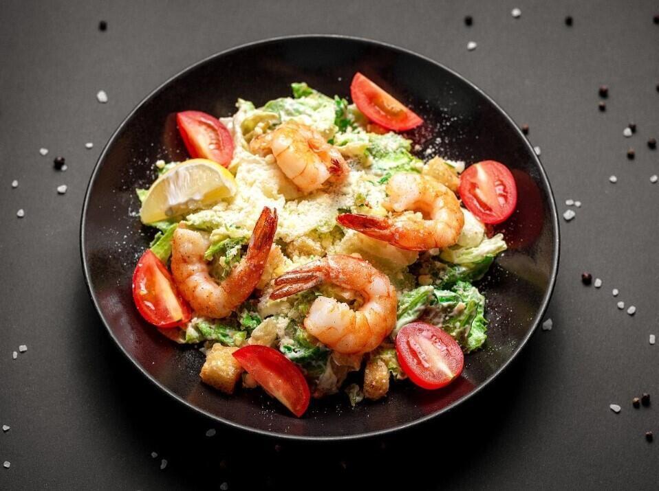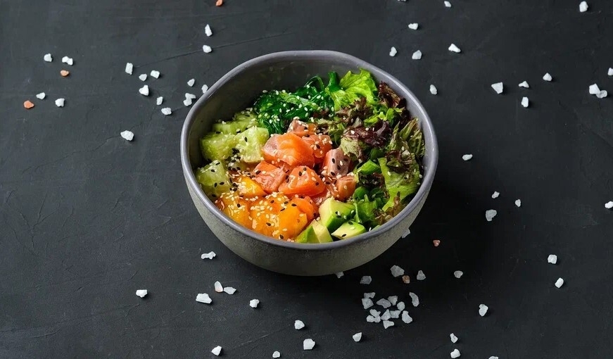 Креветки, киноа, бобы эдамамэ, авокадо, чука, ананас, кешью, паста том ям, кунжут.