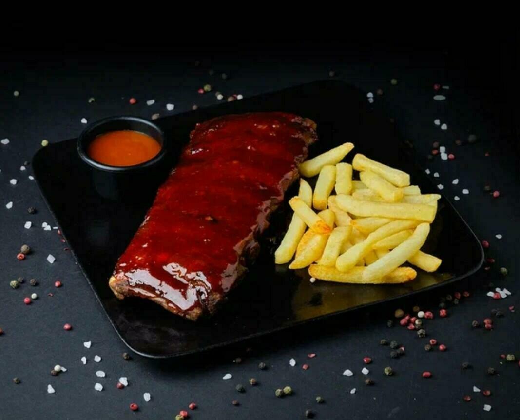 Свиные ребра, приготовленные на гриле, подаются с картофелем фри и соусом BBQ.
