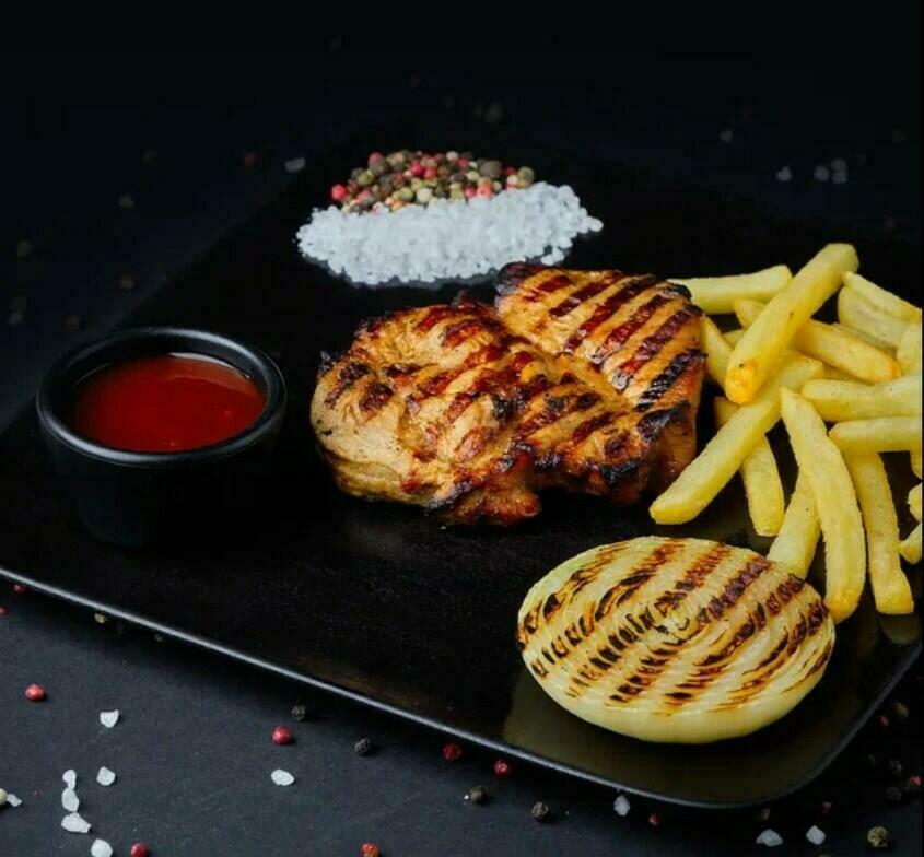 Стейк из свиной шеи в фирменном маринаде, приготовленный на гриле. Подается с картофелем фри, обжаренным луком и соусом BBQ.