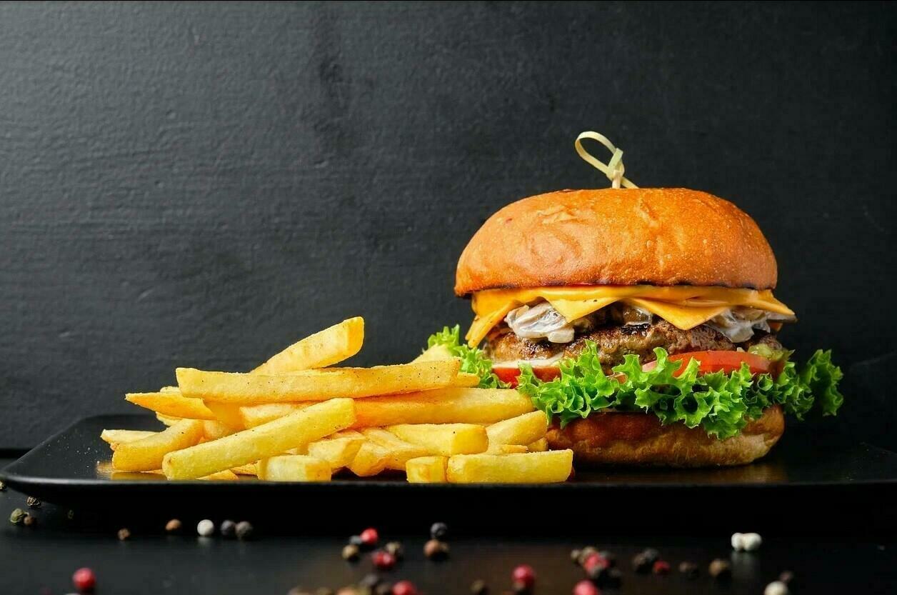 Сочный бургер с котлетой из мраморной говядины, сыром Эмменталь, свежими томатами, огуречным релишем*, листом салата и сливочно-грибным соусом*. Подается с картофелем фри.