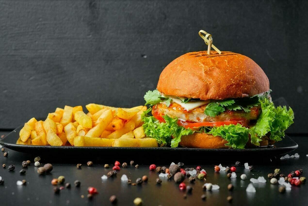 Пикантный бургер с сочной куриной котлетой, листом салата, свежими томатами, кинзой, сыром Эмменталь и соусом сладкий чили. Подается с картофелем фри.