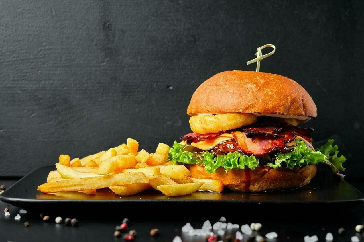 Популярный американский бургер с сочной свино-говяжьей котлетой, беконом, сыром Эмменталь, огуречным релишем*, перцем халапеньо, соусом BBQ, зернистой горчицей и луковыми кольцами фри. Подается с картофелем фри.