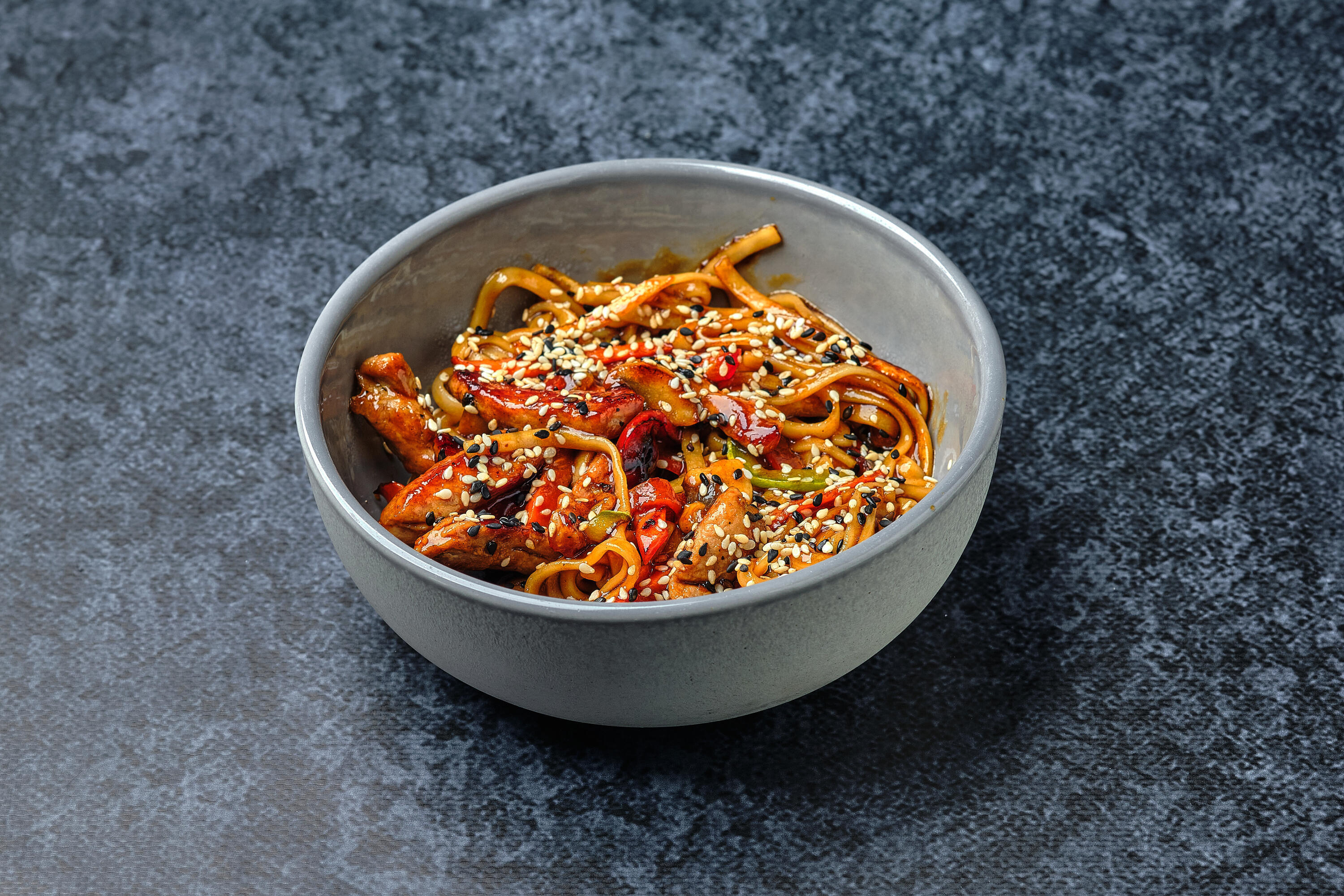 Лапша удон, свинина, обжаренная с кабачком, шампиньонами, болгарским перцем, морковью и кунжутом в соусе Унаги.