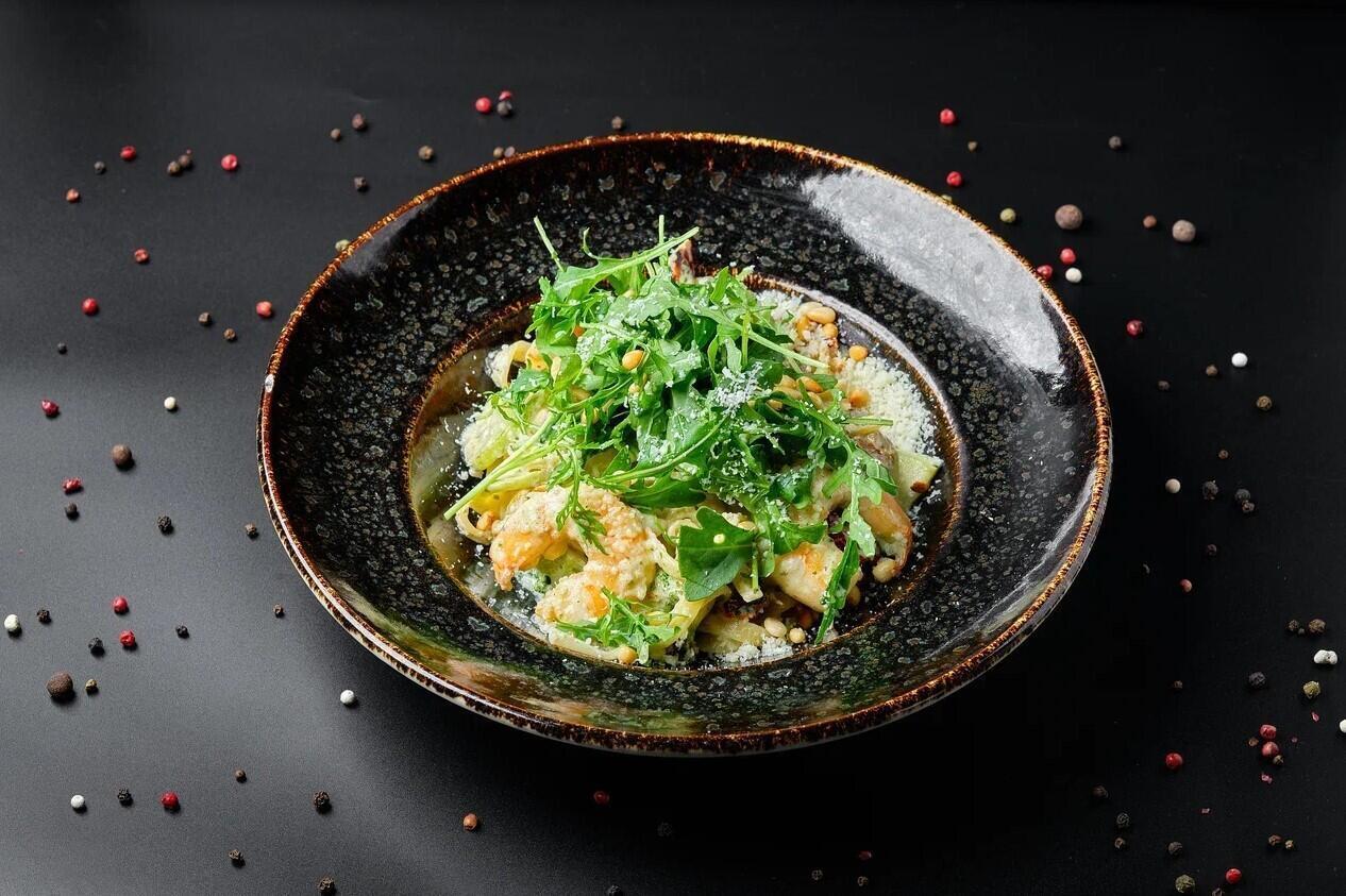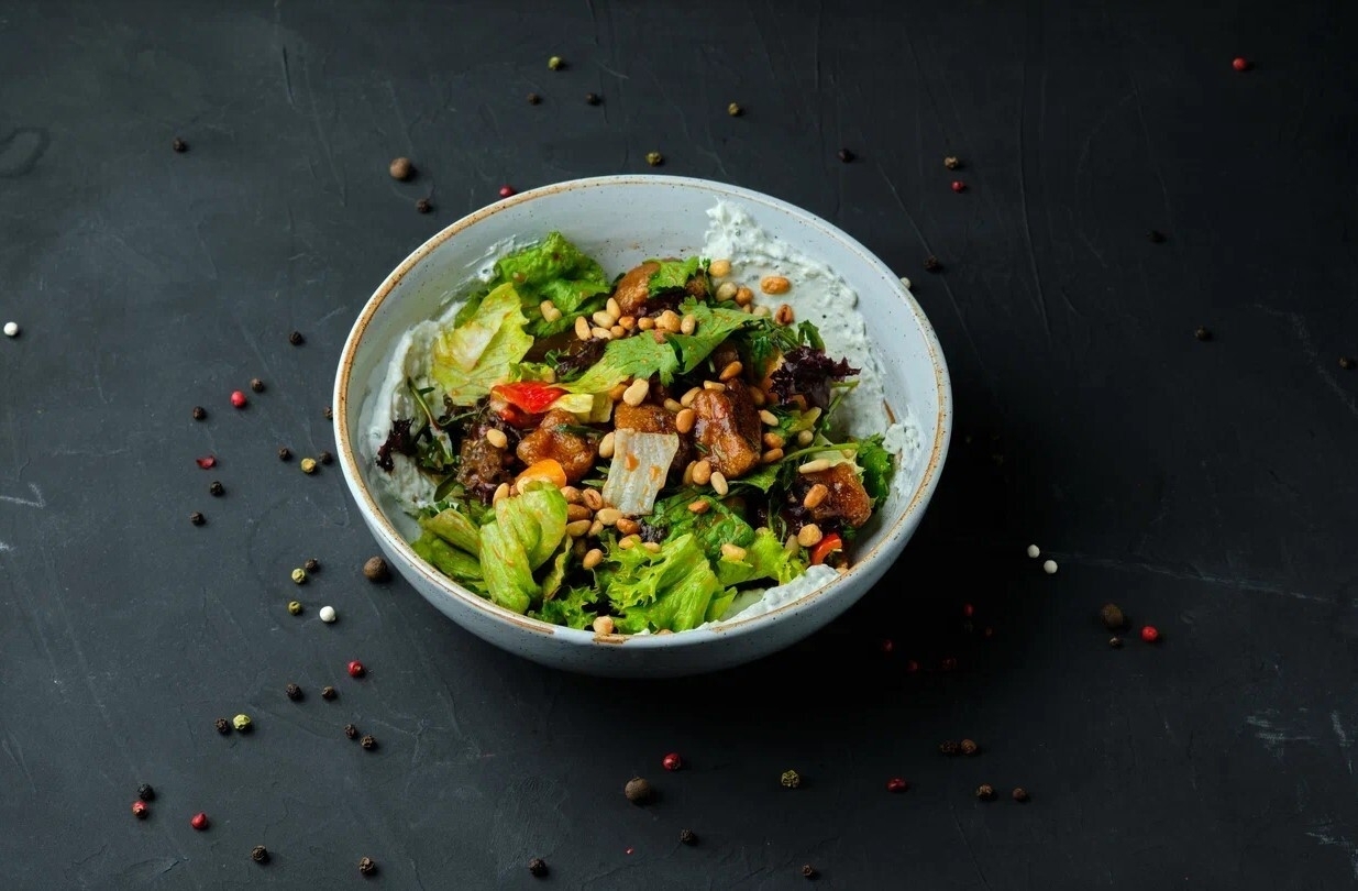Микс листьев салата, руккола, кинза, хрустящий баклажан, маринованный перец, помидор Черри, кедровый орех, гранатовый соус