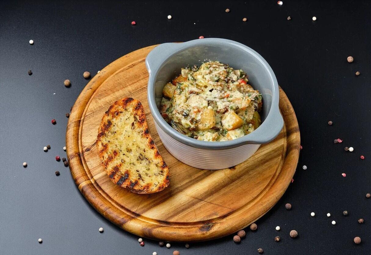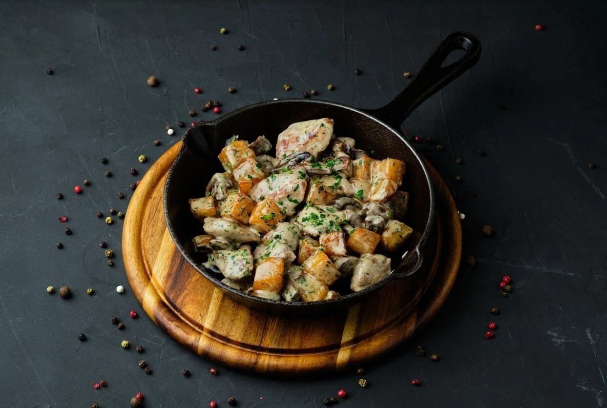 Сковородочка со свининой, картофелем и грибами в перечном соусе