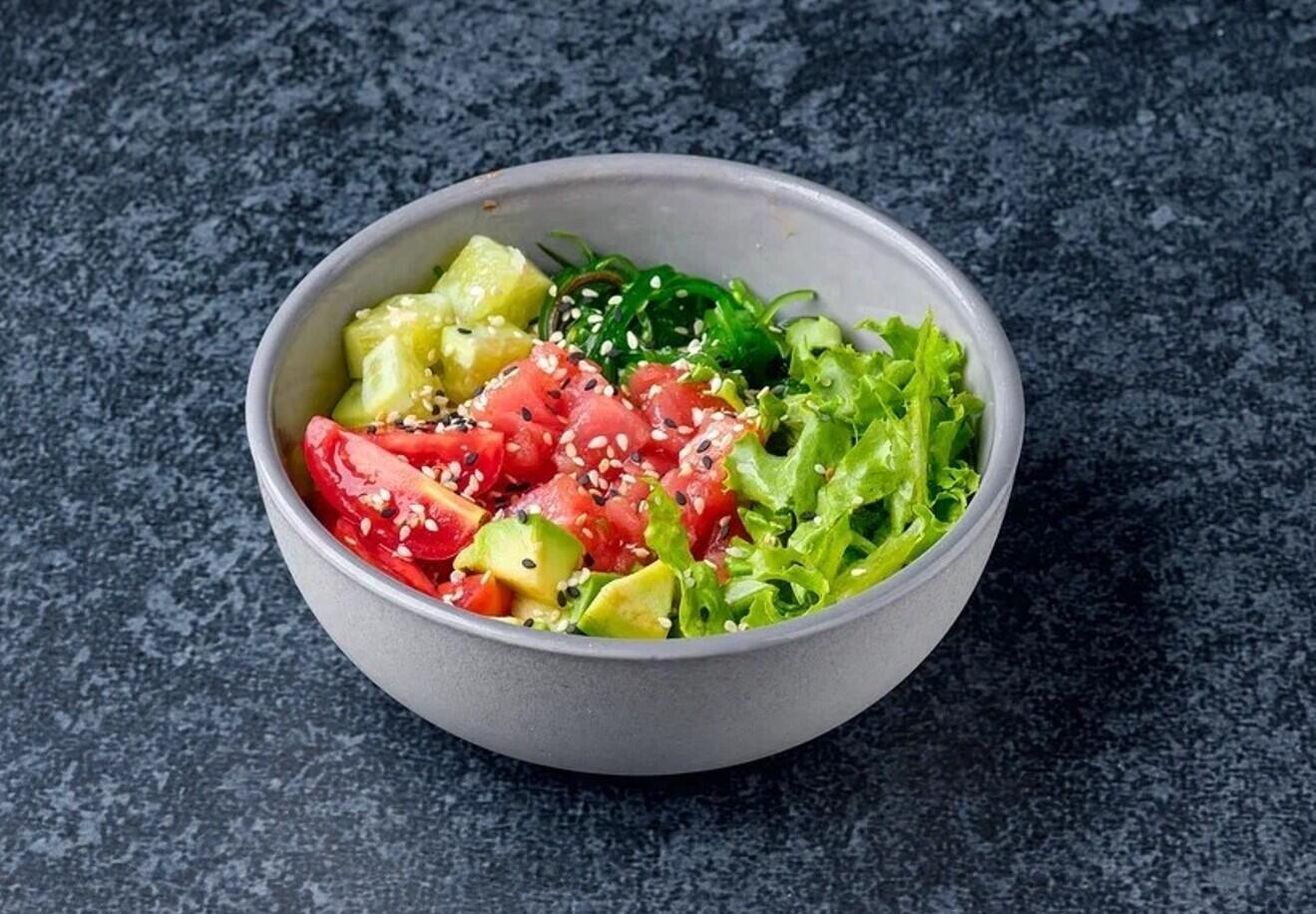 Рис, тунец, черри, чука, огурец, авокадо, лист салата, соусы ореховый кимчи и сладкий чили, кунжут.