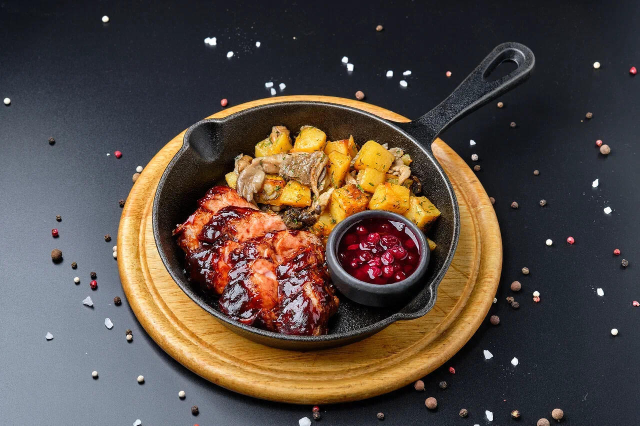 Свиная вырезка, соус хойсин, картофель, шампиньоны жареные, укроп. Подается с соусом клюквенный с джином.