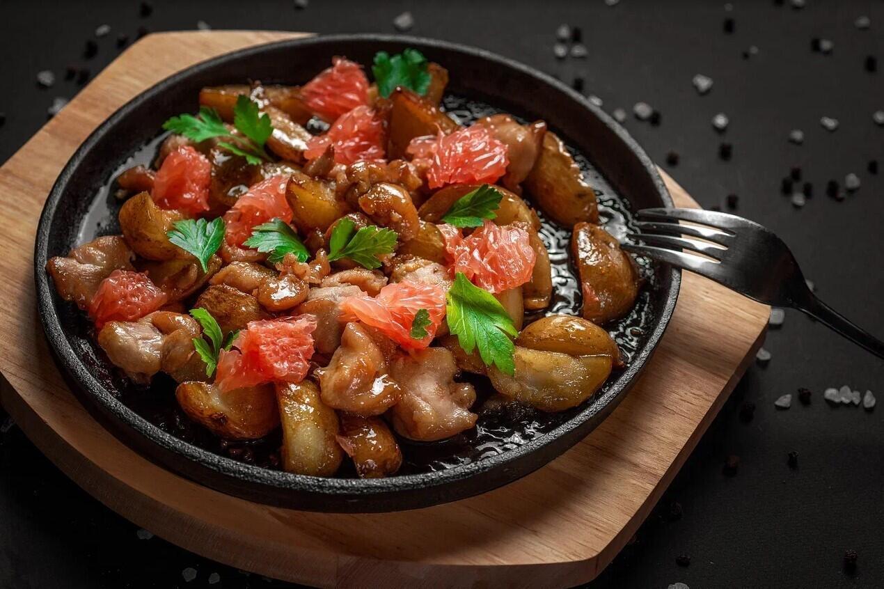 Куриное бедро, обжаренное в соусе чили-карамель с молодым картофелем, кинзой и мякотью грейпфрута.