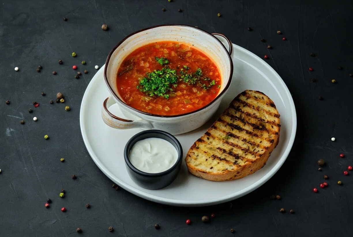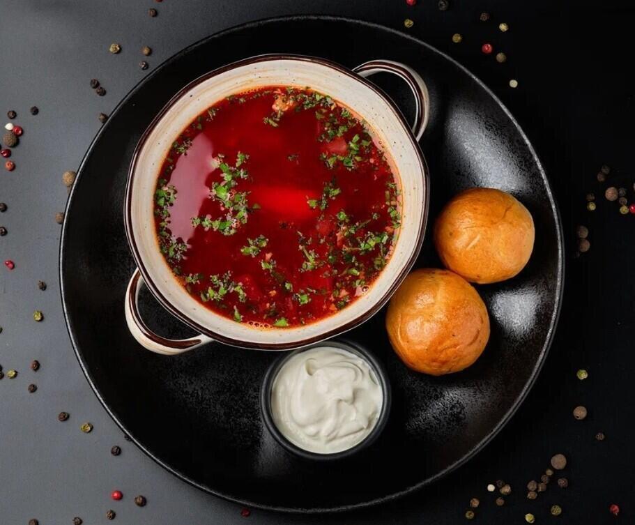 Классический борщ с говядиной. Подается со сметаной и чесночными пампушками.