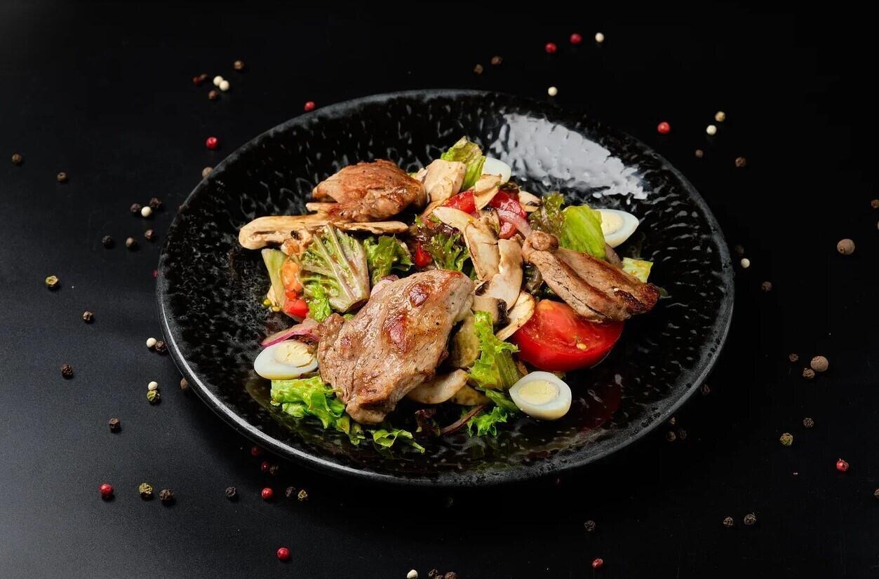 Свиная вырезка гриль, шампиньоны. перепелиные яйца, красный лук, томаты, маслины, листья салата, соус на основе меда и гранатового сока.