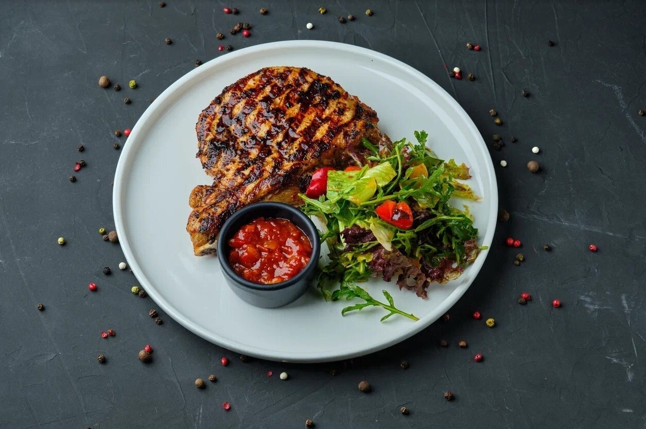 Стейк из свиной корейки, приготовленный на гриле. Подается с соусом Сальса и салатом из овощей и зелени (микс листьев салата, руккола, помидор Черри, маринованный перец, гранатовый соус).