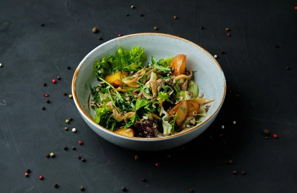 Микс листьев салата, руккола, обжаренные вешенки, шампиньоны и картофель бейби, орехово-горчичный соус, семечки подсолнечника