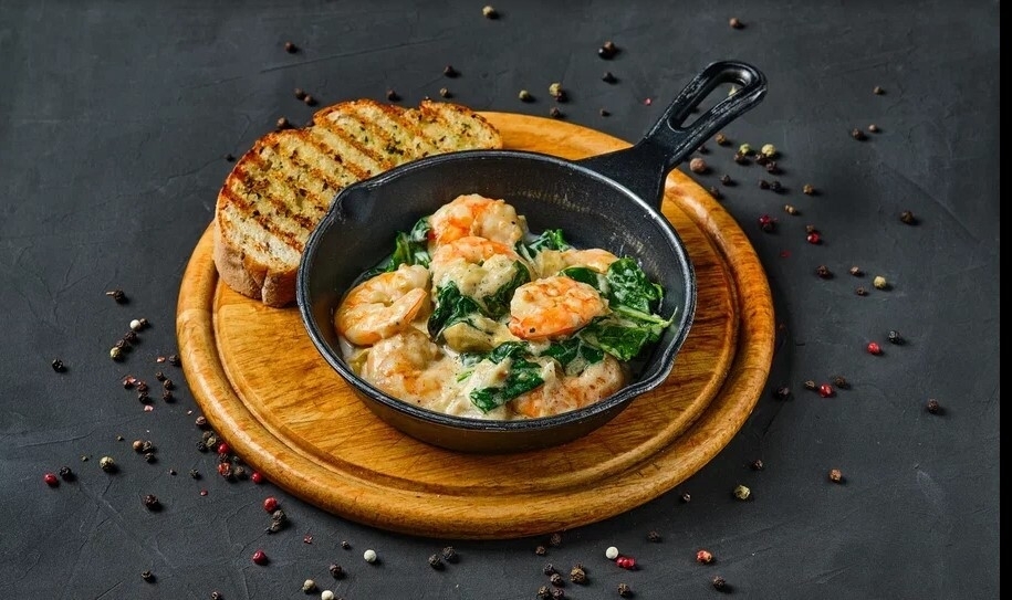 Сливочный суп с отварными тигровыми креветками, красной рыбой, кукурузой и картофелем.