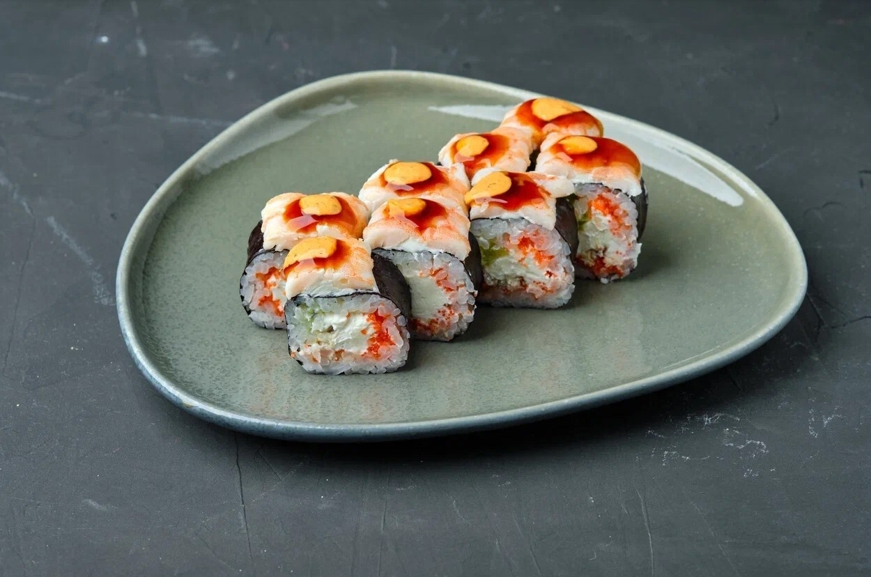 Со сливочным сыром, киви, икрой Тобико, соусами Спайси и Унаги